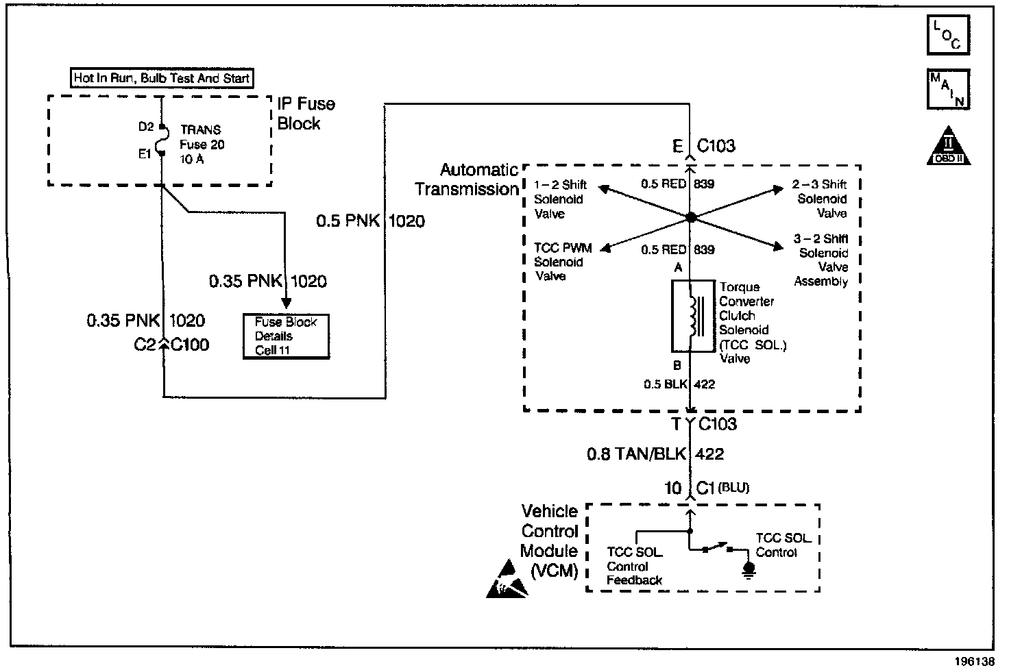 The Torque Converter Clutch Solenoid Valve (TCC Sol. Valve) is an electrical device that is used with the Torque Converter Clutch Pulse Width Modulation Solenoid Valve (TCC PWM Sol. Valve) in order to control TCC apply and release. The TCC Sol. Valve attaches to the transmission case assembly extending into the pump cover. The TCC Sol. Valve receives ignition voltage through circuit 1020. The Vehicle Control Module (VCM) controls the solenoid by providing the ground path on circuit 422. The VCM monitors the Throttle Position (TP) voltage, the vehicle speed, and other inputs in order to determine when to energize the TCC Sol. Valve.