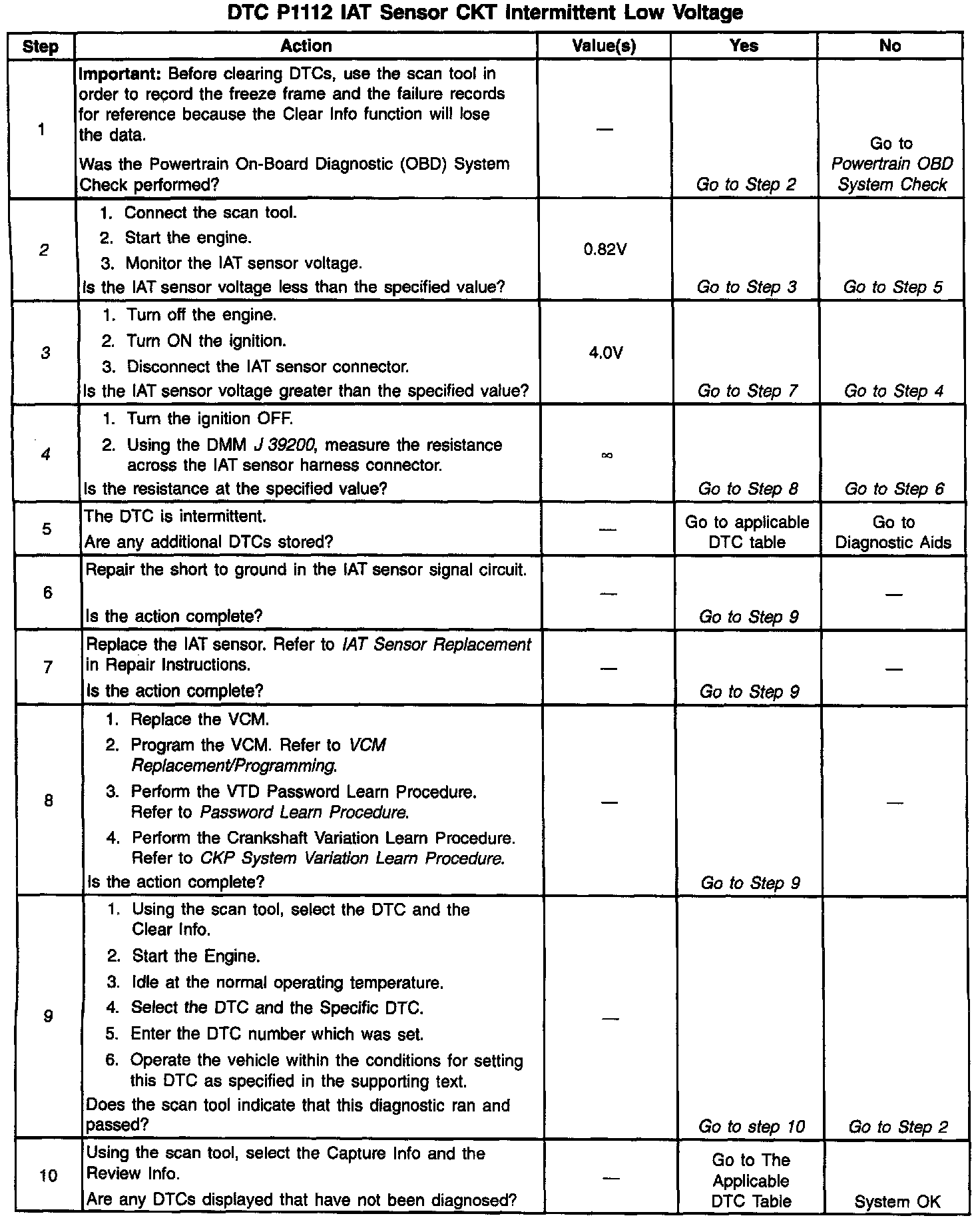 A scan tool indicates the temperature of the ambient air entering the throttle body. The air temperature should read very close to the temperature of the outside air and should rise gradually as the engine warms up and the underhood temperature increases. If DTC P1112 is set, the problem is intermittent. Check for a short to ground in the IAT sensor signal circuit. Accomplish this by moving the VCM harness at various locations and monitoring the IAT temperature or the IAT voltage on the scan tool. If the voltage varies, look for a short to ground in the area of the harness that caused the waiver. Also, a sensor may become skewed or mis-scaled. The Temperature vs. Resistance Value Table will help to detect a skewed sensor. Refer to Specifications / Electrical / Temperature vs Resistance.