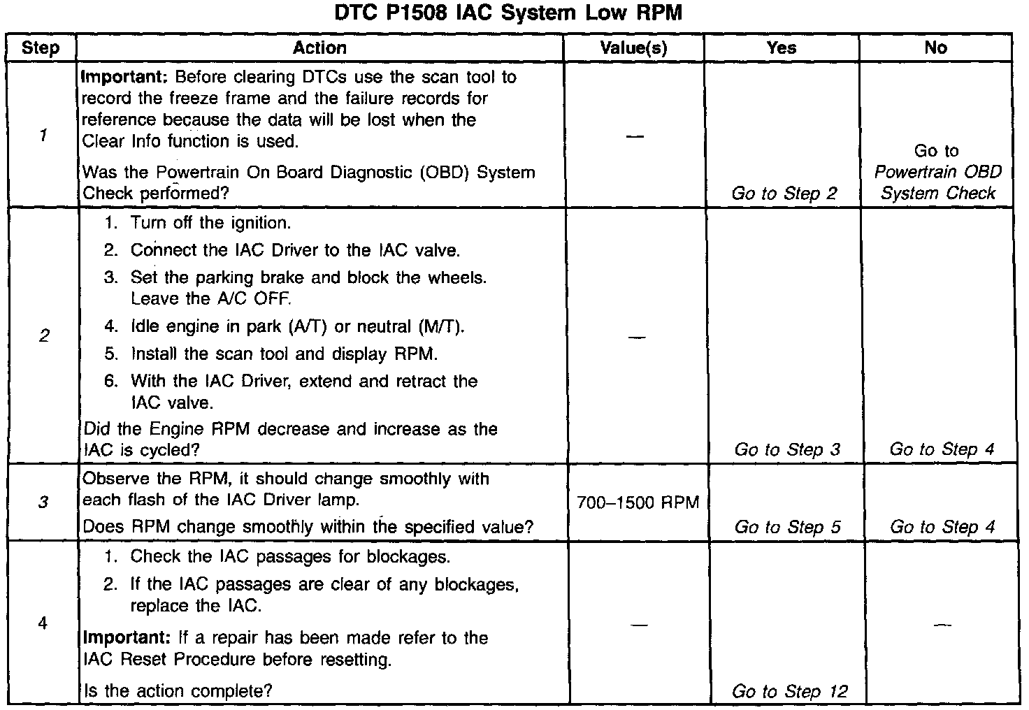 2. This step checks the quality of the IAC movement in step 1. Between 700 RPM and about 1200 RPM, the engine speed should change smoothly with each flash of the tester lamp in both extend and retract. If the IAC valve is retracted beyond the control range (about 1500 RPM), it may take many flashes in the extend position before engine speed will begin to drop. This is normal on certain engines, fully extending IAC may cause engine stall. This may be normal.