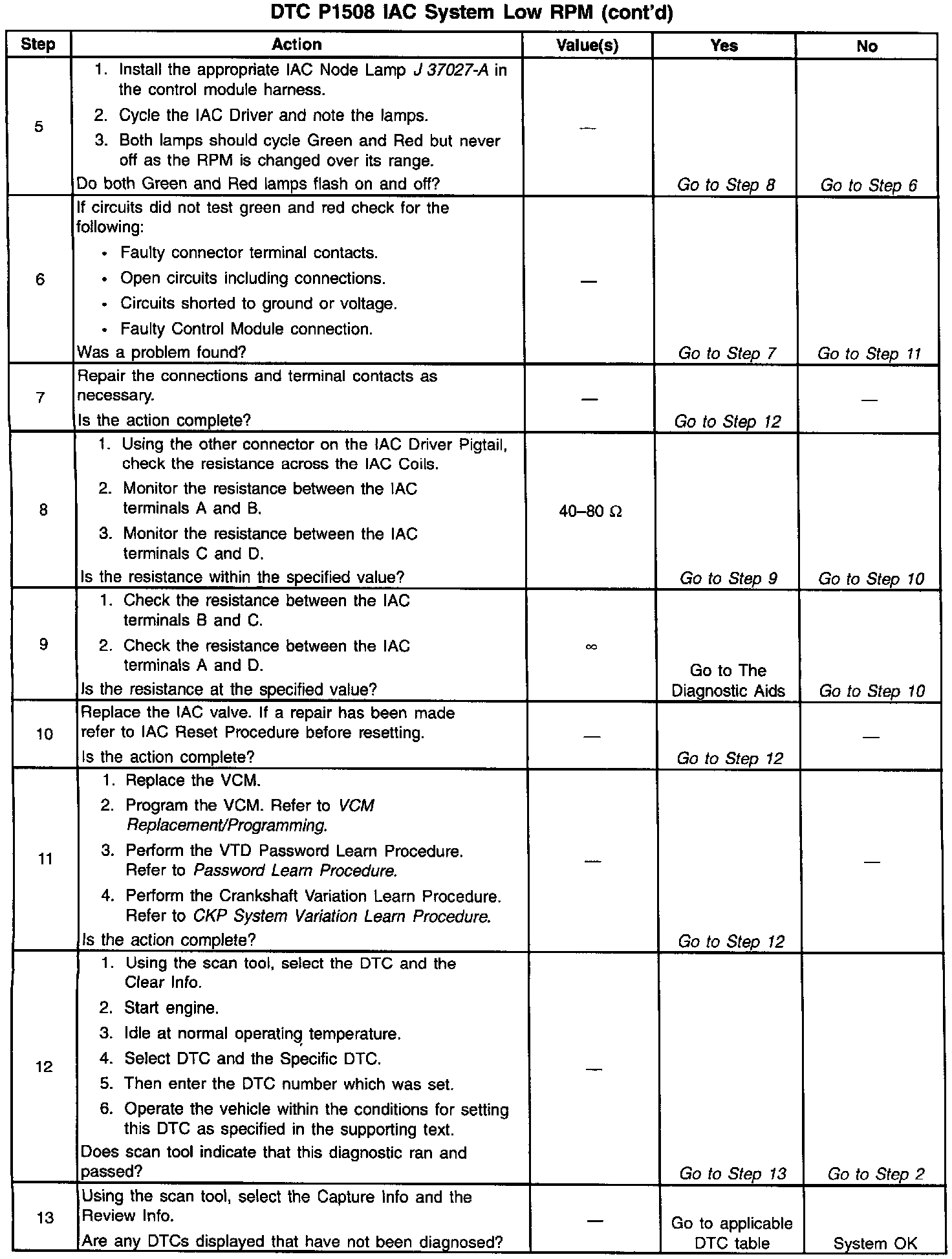 An IAC valve which is stopped and can not respond to the VCM, a throttle stop screw which has been tampered with, or a damaged throttle or linkage could cause this DTC. A slow, unstable, or fast idle may be caused by a non - IAC valve system problem that cannot be overcome by the IAC valve. Out of range control IAC scan tool counts will be above 60 if idle is too low and zero if idle is too high. Check for the following conditions: