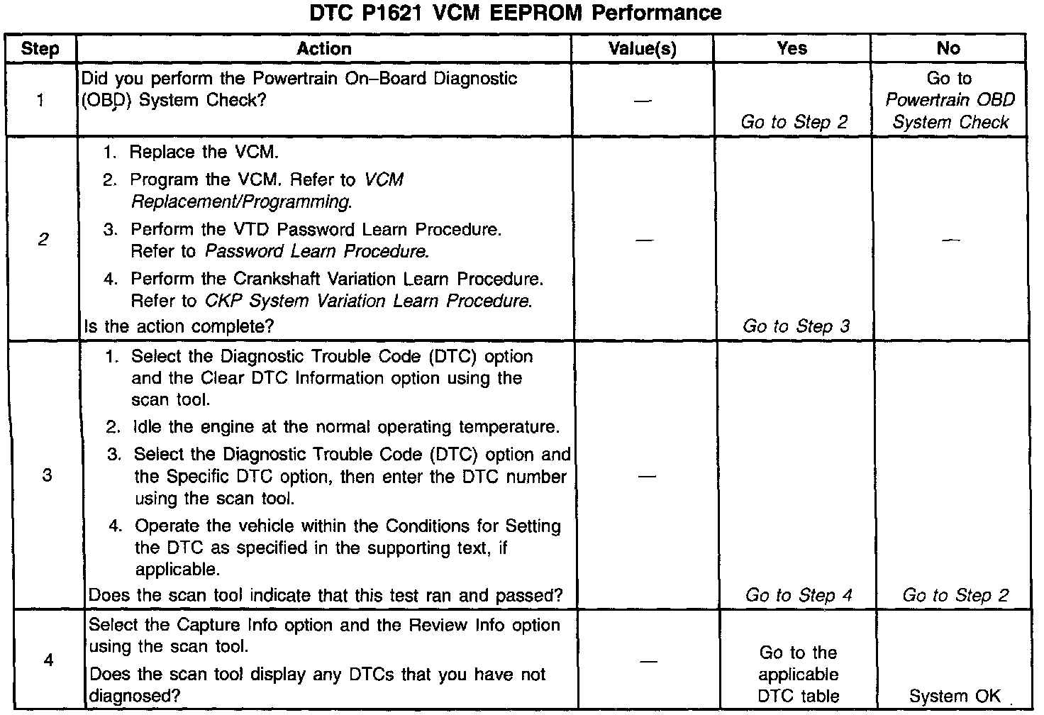 The VCM EEPROM contains data which is essential to running the engine and transmission. The VCM program stores this data in the EEPROM. This data remains in the EEPROM even if the battery is disconnected. At powerup, the VCM checks the integrity of this data. If the checksum of the EEPROM does not match a predetermined value, DTC P1621 sets.