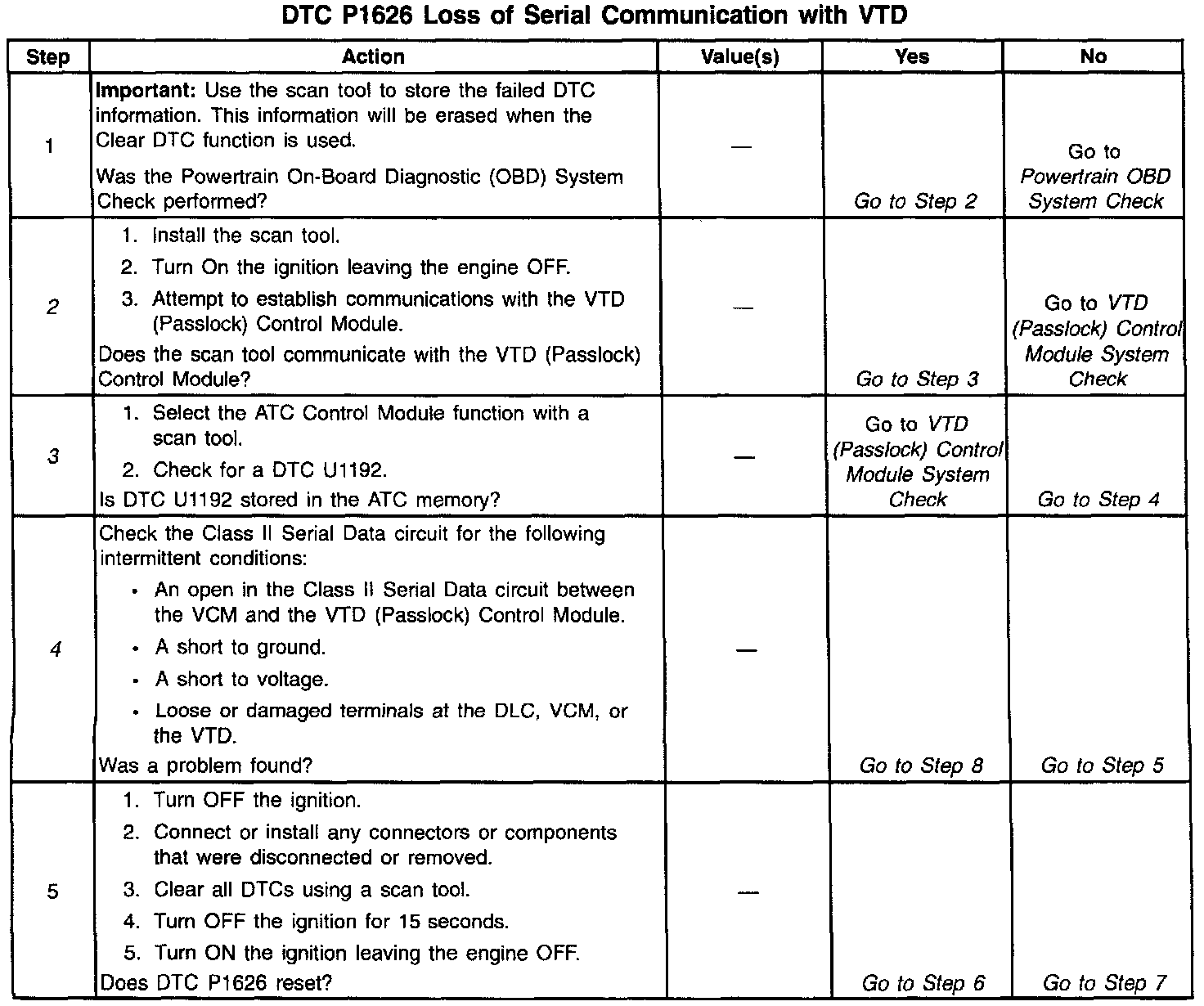 - If a VCM P1626 code is set, but a VCM DTC U1192 is not, then the VTD (Passlock) Control Module may be malfunctioning.