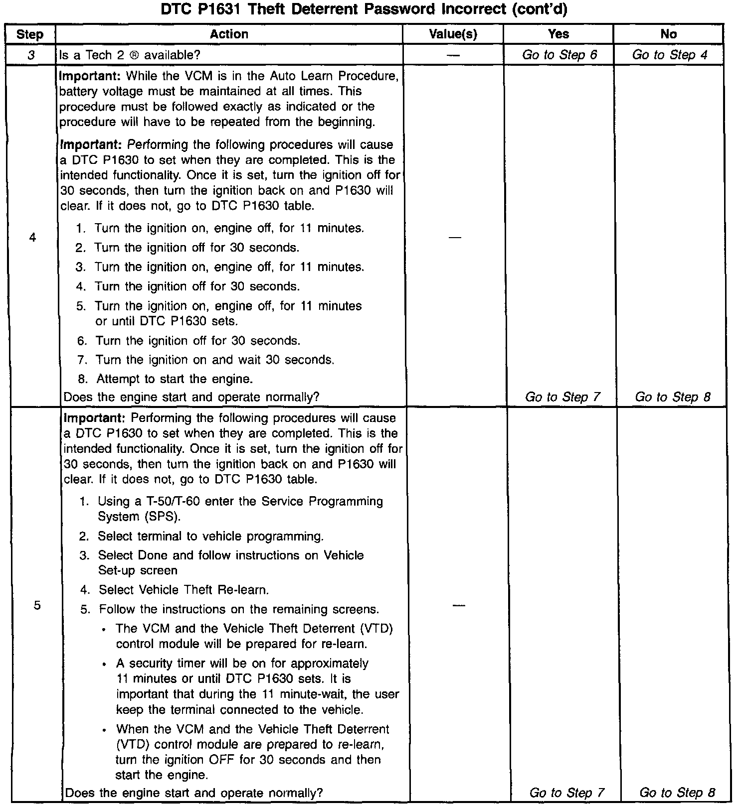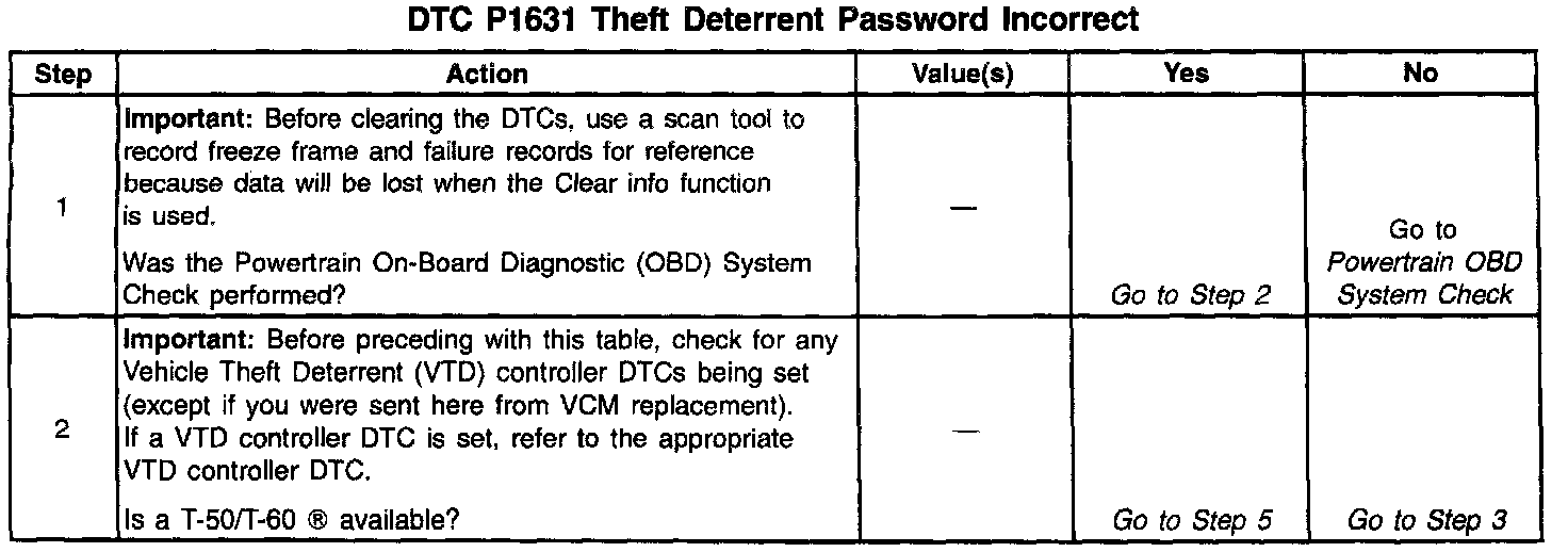 - When the VCM receives a password from the VTD (Passlock) Control Module that does not match the stored password, a DTC P1631 should be present. Check for VTD codes first; if no codes are present, then force a relearn of the password. Refer to Password Learn Procedure.