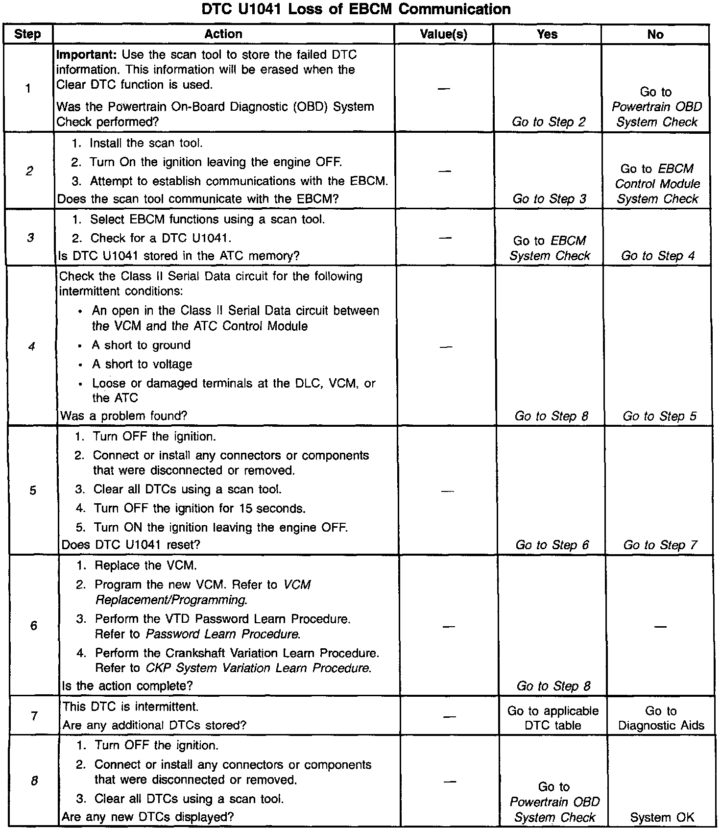 ^ If the Class II Serial Data line is shorted to ground or shorted to voltage, all the modules or systems connected to the Class II Serial Data line will not be able to communicate properly. These systems or modules are capable of storing loss of communications DTCs (DTCs with the letter U as a prefix) in their memory. If a DTC U1041 is stored in the VCM memory, check for the same DTC stored in the Active Transfer Case (ATC) Control Module. The ATC Control Module also monitors the Node Alive/SOH message from the EBCM. If the ATC Control Module has a DTC U1041 stored, check the EBCM for an intermittent malfunction. If the ATC Control Module has a DTC U1041 stored, check for an open in the Class II Serial Data circuit between the VCM and the EBCM. The VCM must also be checked for intermittent operation due to a loss of power or ground to the VCM itself. After repairing the cause of a DTC U1041, clear all DTCs form all systems capable of storing this DTC.