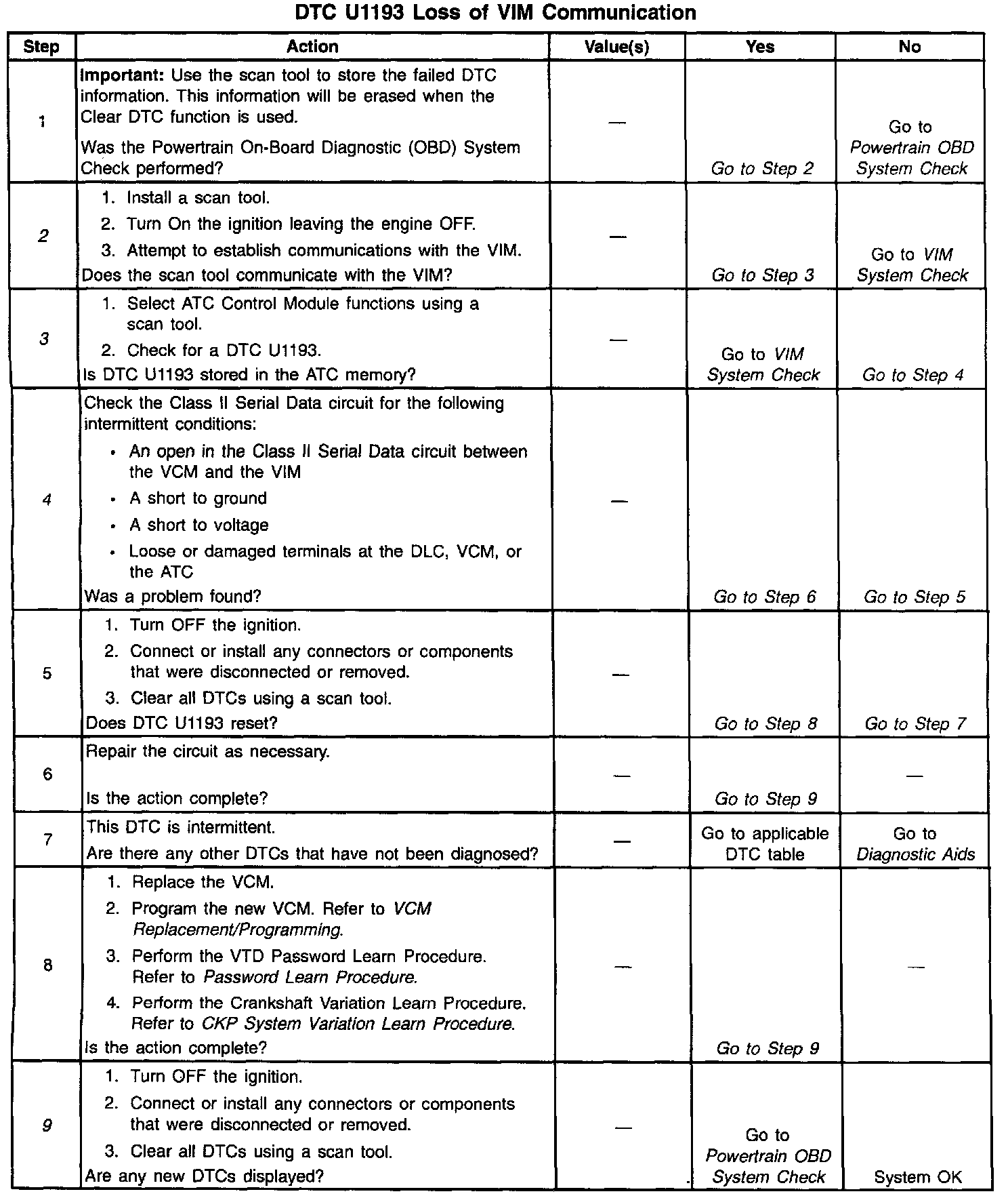 If the ATC Control Module does not have a DTC U1193 stored, check for an open in the Class II Serial Data circuit between the VCM and the VIM. The VCM must also be checked for intermittent operation due to a loss of power or ground to the VCM itself. After repairing the cause of a DTC U1193, clear all DTCs from all systems capable of storing this DTC