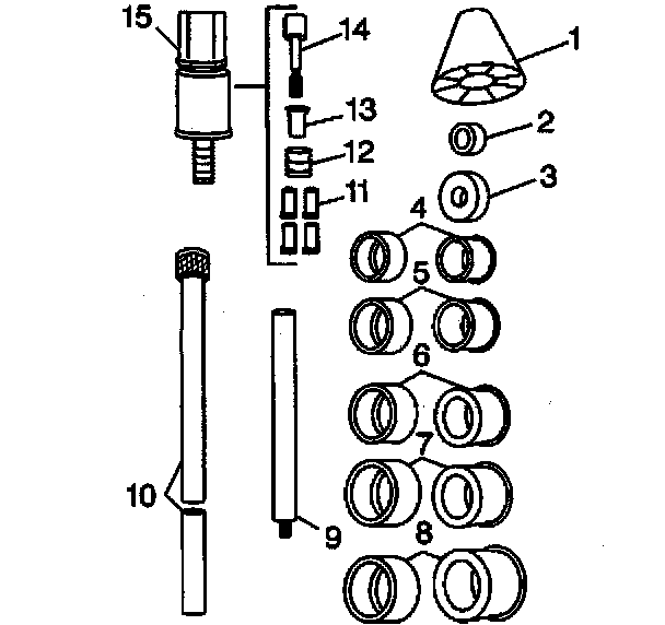 1. Select the cone (1), the handle (10), the expanding driver (4-8), the washer (2 or 3), and the expander assembly (15) from the J 33049.