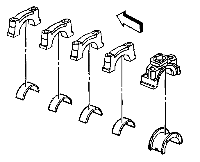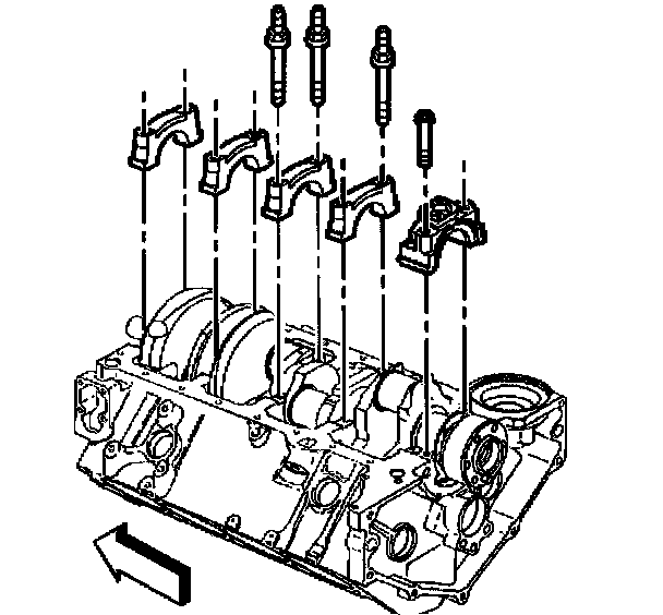 7. Install the crankshaft bearing caps in the original positions and with the arrow on the crankshaft bearing caps in the direction of the front of the engine block.