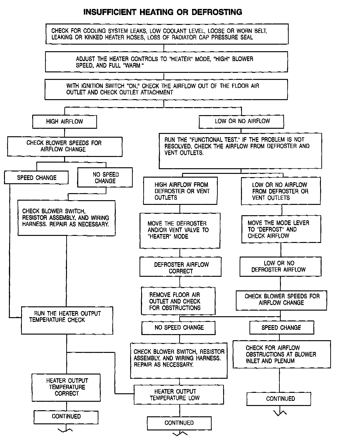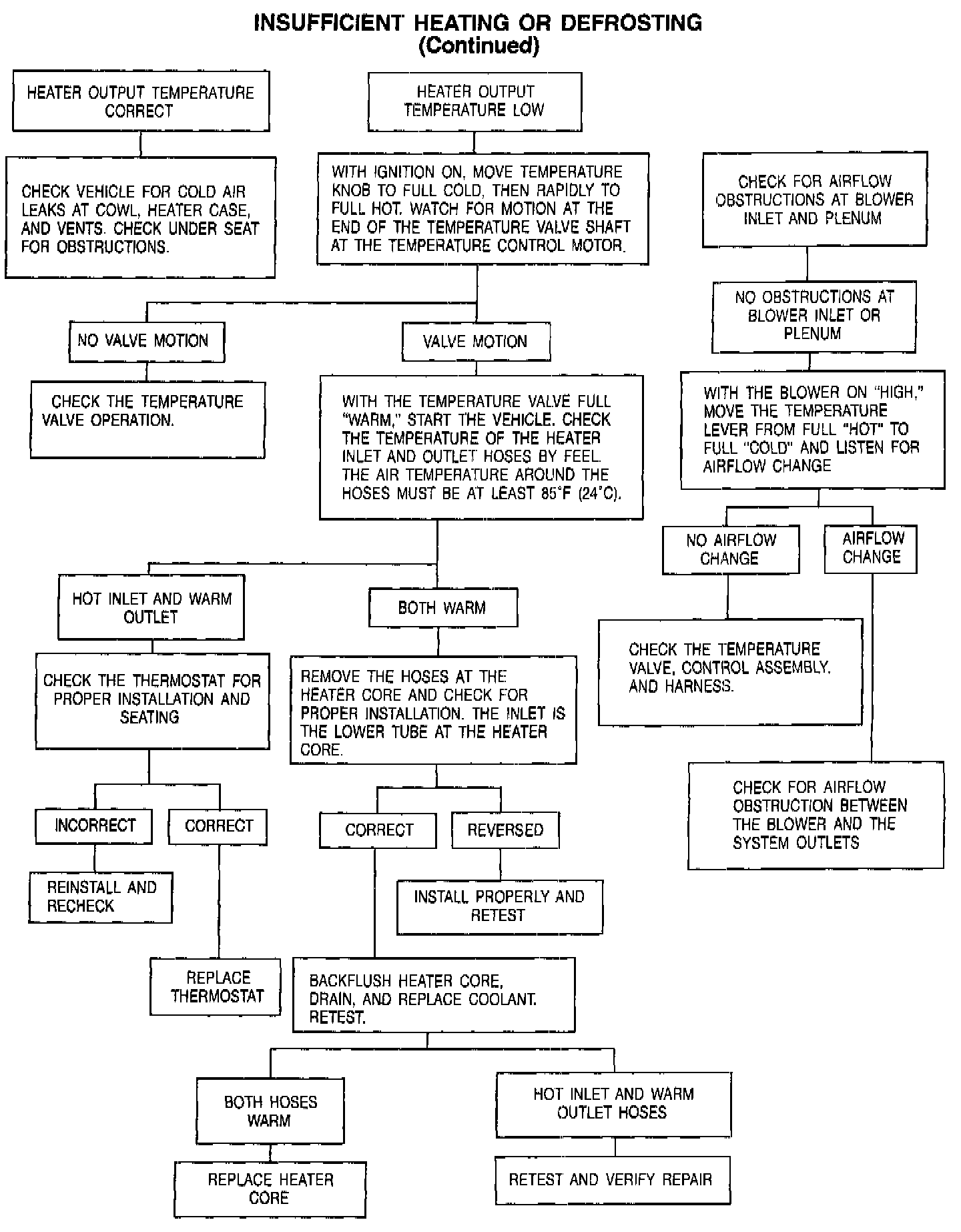 The most likely causes of insufficient heating outside the heater system include a low coolant level, a faulty thermostat, a partially or fully clogged heater core or hose, an obstruction to air circulation or an air leak past a faulty seal into the passenger compartment.
