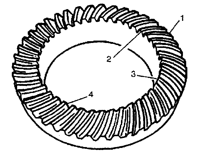 The side of the ring gear tooth which curves outward, or is convex, is the drive side (4). The concave side is the coast side (3). The end of the tooth nearest the center of the ring gear is the toe end (2). The end of the tooth farthest away from the center is the heel end (1).