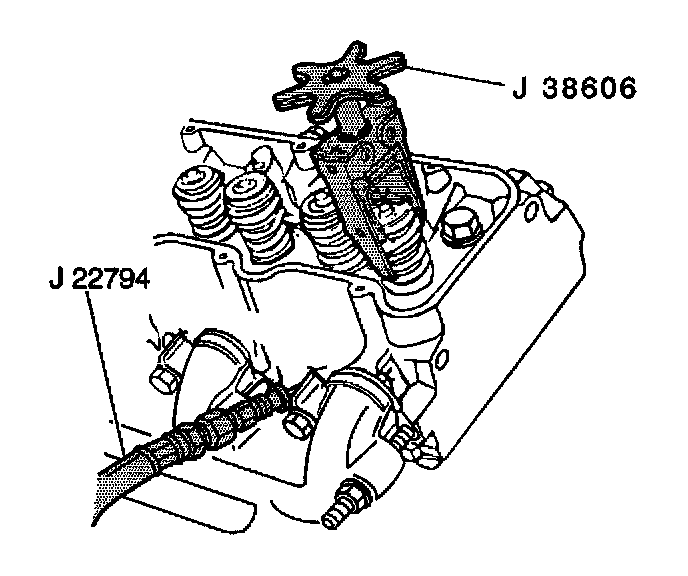 NOTICE: When using J 38606 ensure the jaws are completely engaged on the valve spring. If the jaws are not completely engaged the jaws may slip off and scratch the valve spring. Replace the valve spring if the valve spring becomes scratch.