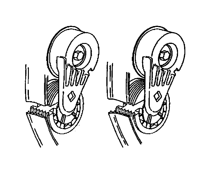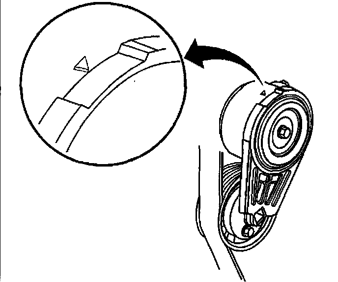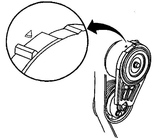 10. Confirm for the proper drive belt size and the correct drive belt routing by observing the location of the fix pointer and the index marks on the drive belt tensioner. With a new drive belt installed, the fix pointer should align within the indentation on the drive belt tensioner.