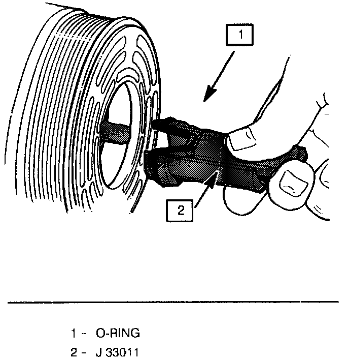 2. Insert the O-ring installer J 33011 into the compressor neck until the installer "bottoms." Lower the moveable slide of the O-ring installer to release the O-ring into the seal O-ring lower groove. (The compressor neck top groove is for the shaft seal retainer ring.) Rotate the installer to seat the O-ring and remove the installer.