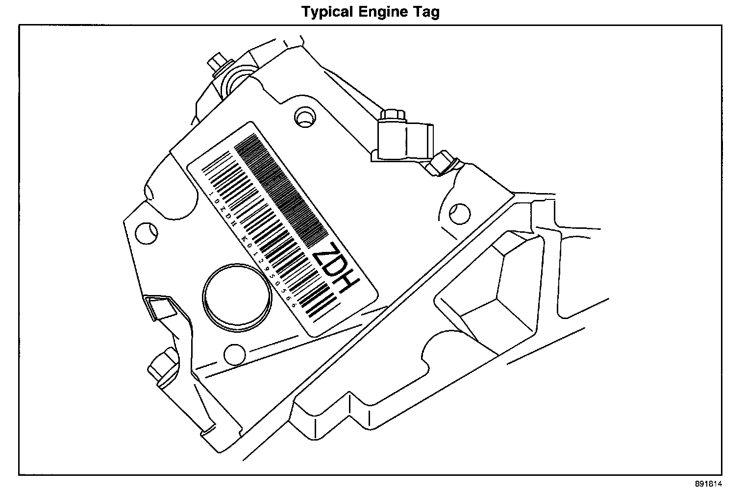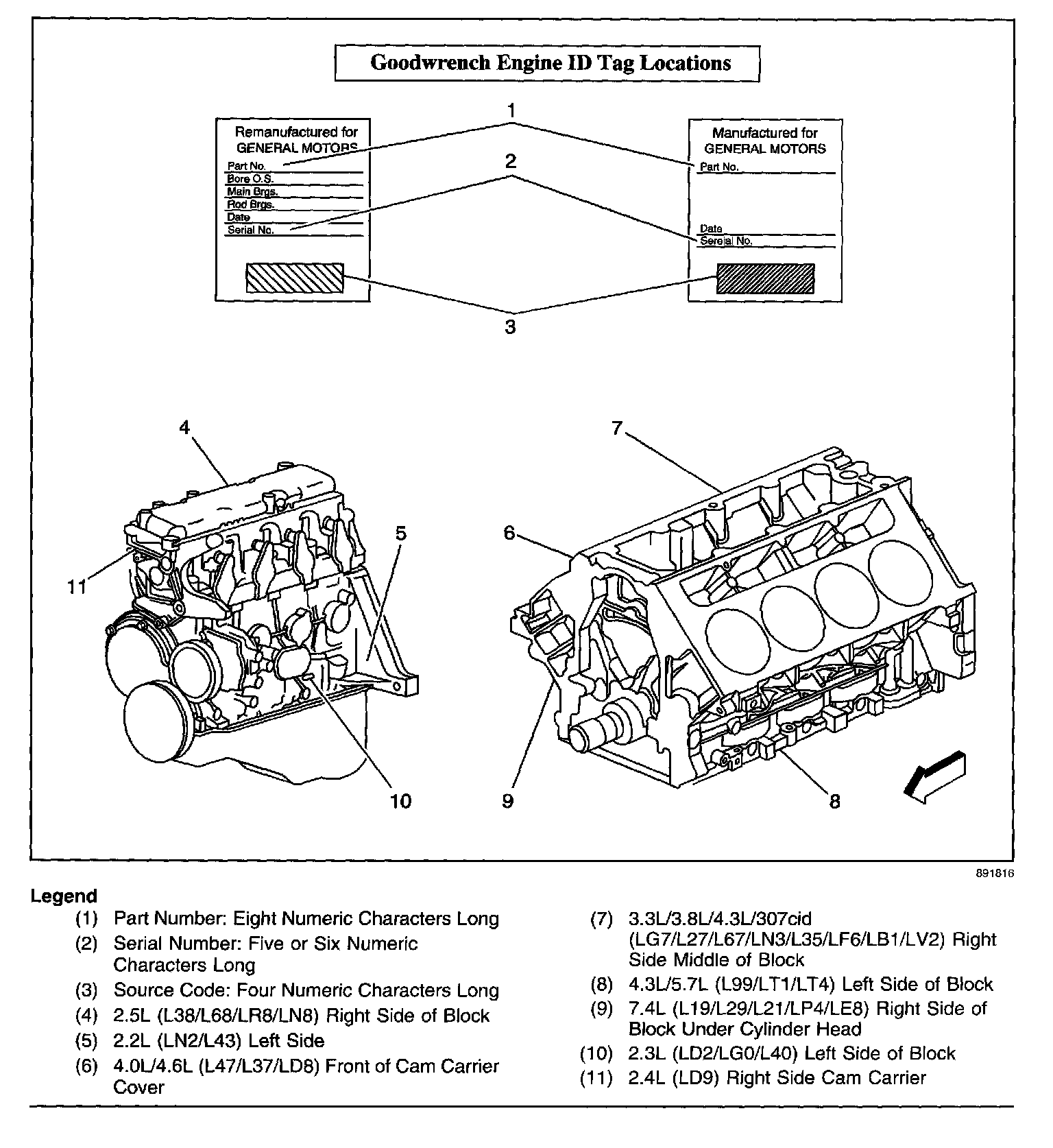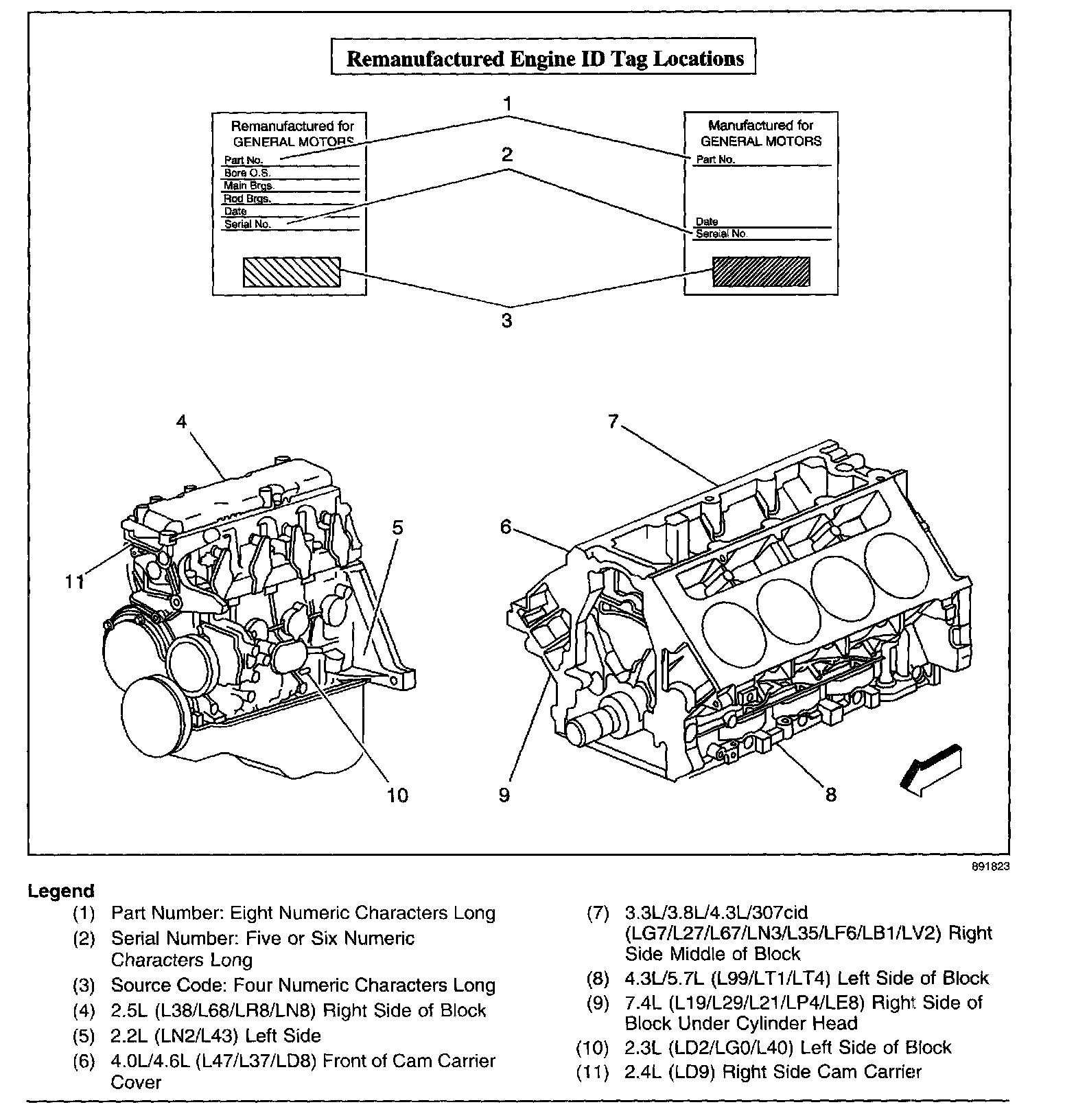 This bulletin covers the location of the engine identification information for OEM, service, Goodwrench(R) and remanufactured engines. The OEM information is a paper bar code tag attached to the engine. The Goodwrench(R) information is on a metal tag attached to the engine.