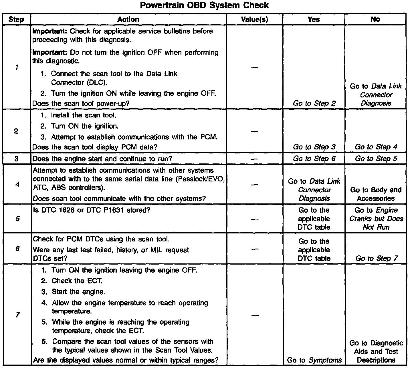 The On Board Diagnostic (OBD) System Check is an organized approach in identifying a problem created by an electronic engine system fault. The OBD system check is the starting point for any driveability diagnosis. The OBD system check directs the service technician to the next step in diagnosing the complaint. Do not perform this check if no driveability complaint exists. Understanding the table correctly reduces the diagnostic time. Understanding the table correctly prevents the replacement of good parts.