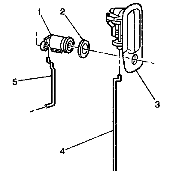 1. Press the lock cylinder (1) in the outside door handle (3) in order to engage the lock cylinder retainer.