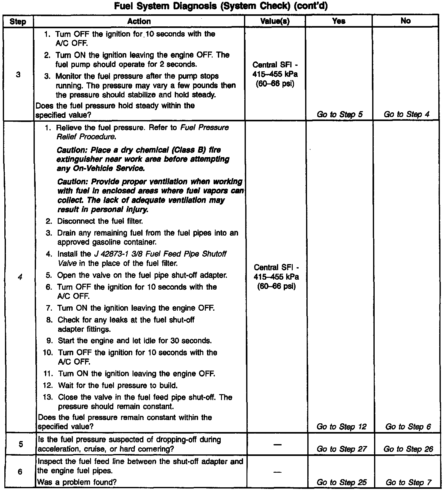^ The pressure is regulated but less than 415 kPa (60 psi).The amount of fuel reaching the injector is sufficient, but the pressure is too low. The system will run lean, hard starting cold, no start, overall poor performance, and may set a DTC. Refer to Engine Cranks but Does Not Run. Engine Cranks, But Will Not Run