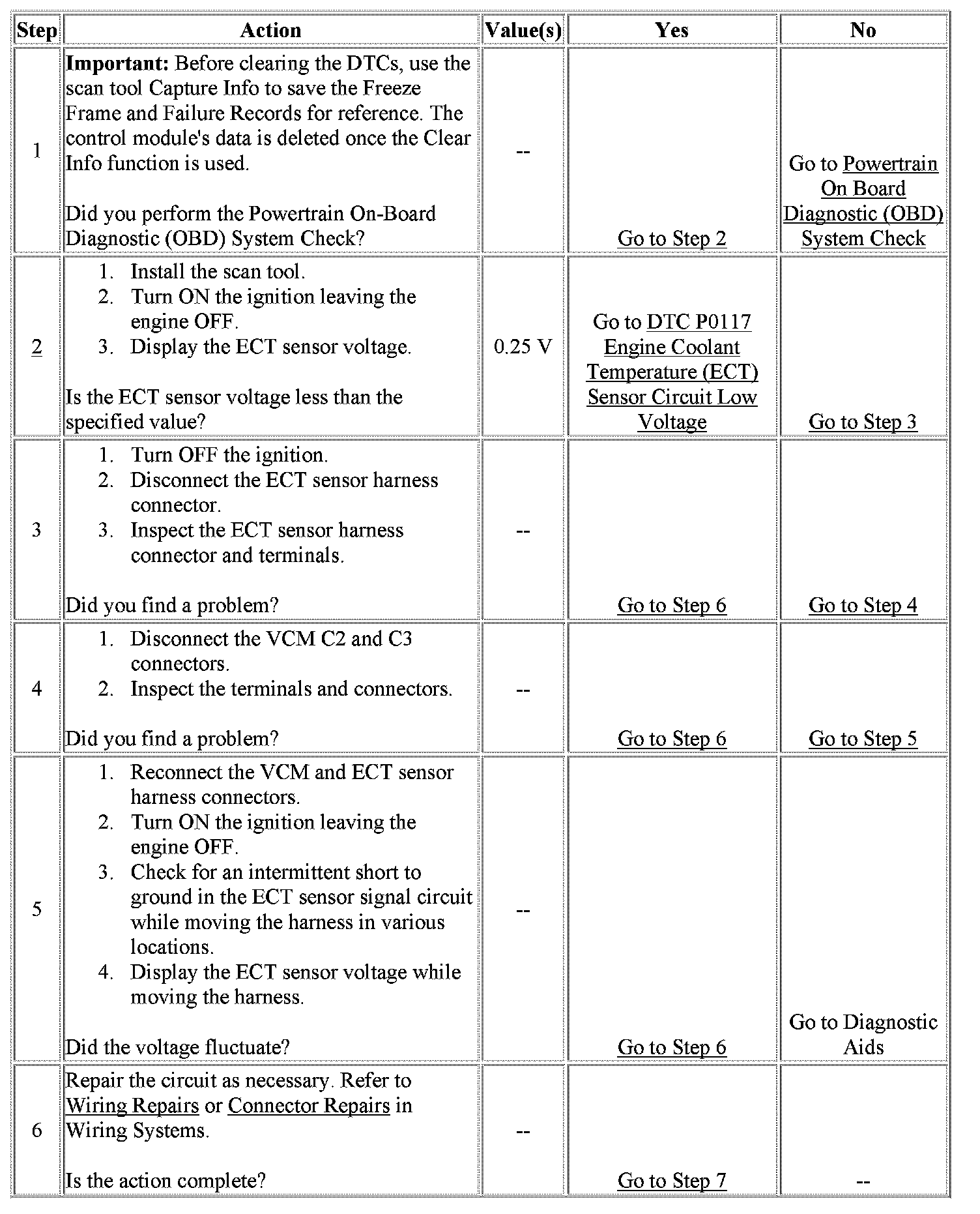 2. If the ECT sensor voltage is less than 0.24 volts, then the condition is present. Even though DTC P0117 did not set, this DTC is more comprehensive and may aid in diagnosis.