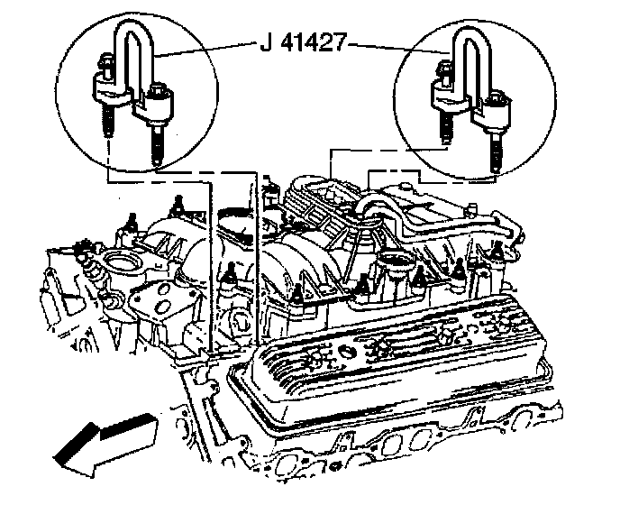 32. Attach the J 41427 to the left front and right rear intake manifold mounting bolts, using the following procedure: