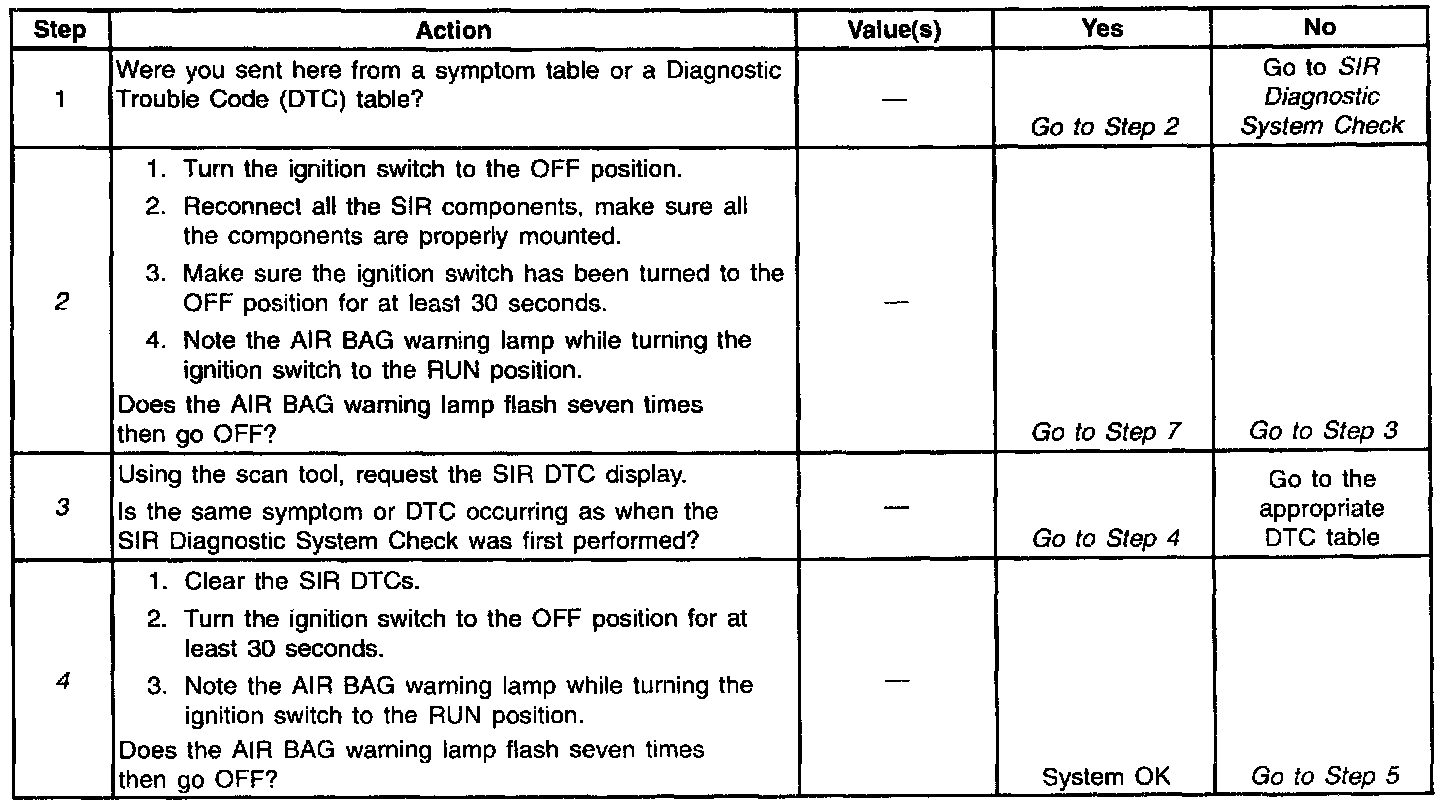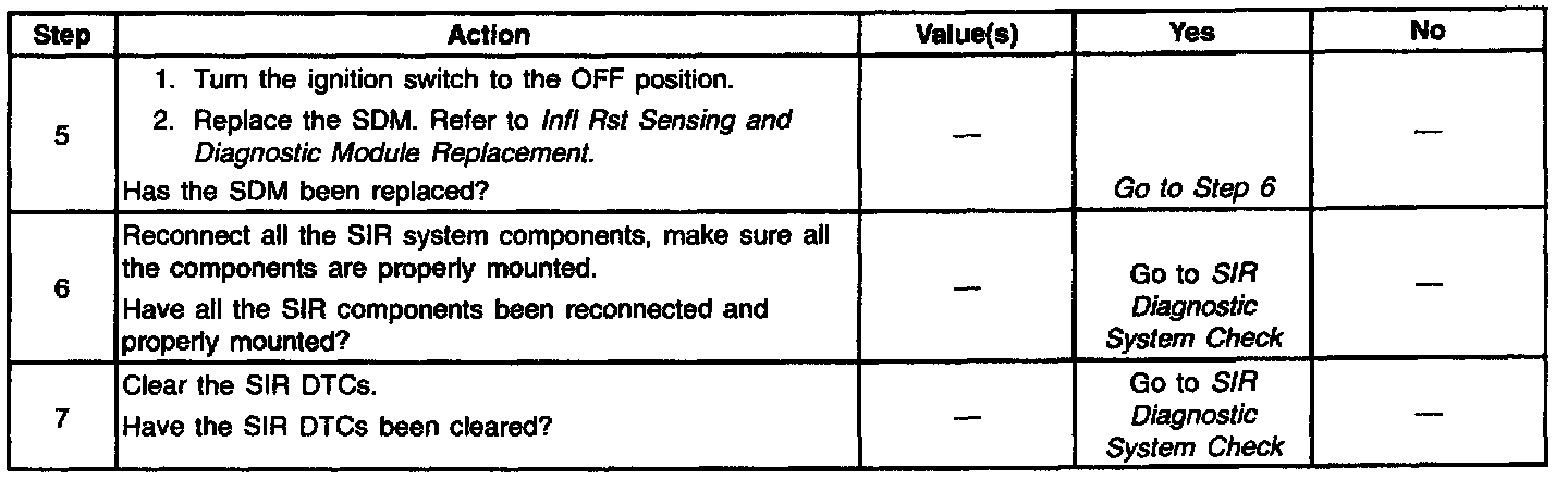 This table assumes that the SIR Diagnostic System Check and either a symptom table or a Diagnostic Trouble Code table diagnosis has been performed. When all circuitry outside the SDM has been found to operate properly, as indicated by the appropriate diagnostic table, and the symptom or DTC remains current, the following diagnostic procedures must be performed to verify the need for SDM replacement.