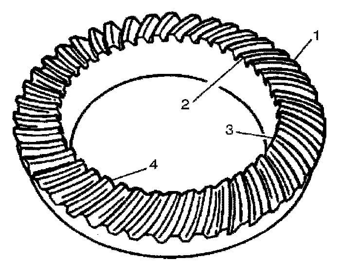 The side of the ring gear tooth which curves outward, or is convex, is the drive side (4). The concave side is the coast side (3). The end of the tooth nearest the center of the ring gear is the toe end (2). The end of the tooth farthest away from the center is the heel end (1).