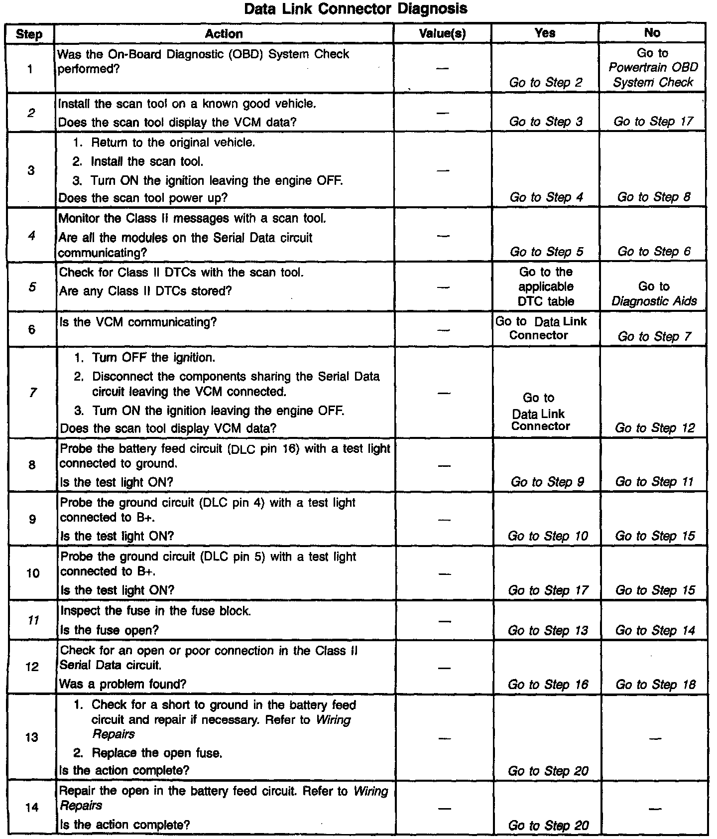 The Class II Serial Data circuit to the Data Link Connector (DLC) allows bi-directional communication between the Vehicle Control Module (VCM) and the scan tool. This is accomplished through pin 2 of the DLC. If communication between the scan tool and the VCM cannot be established, the procedure in the DLC Diagnosis table should be used to diagnose the condition.