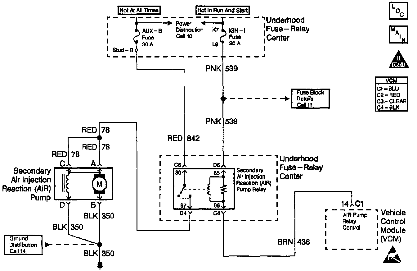 A fused ignition voltage is supplied to the AIR relay. The Vehicle Control Module (VCM) controls the AIR pump by grounding the AIR relay control circuit. This energizes the relay and supplies voltage to the AIR pump clutch. When the fuel system goes to the Closed Loop mode, the VCM opens the ground to the AIR control circuit.