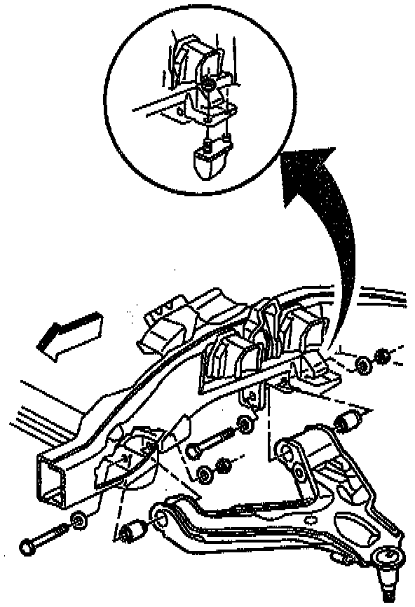 3. Install the lower control arm and the knuckle assembly to the crossmember and the frame bracket. Install the front leg of the lower control arm into the crossmember before installing the rear leg into the frame bracket.