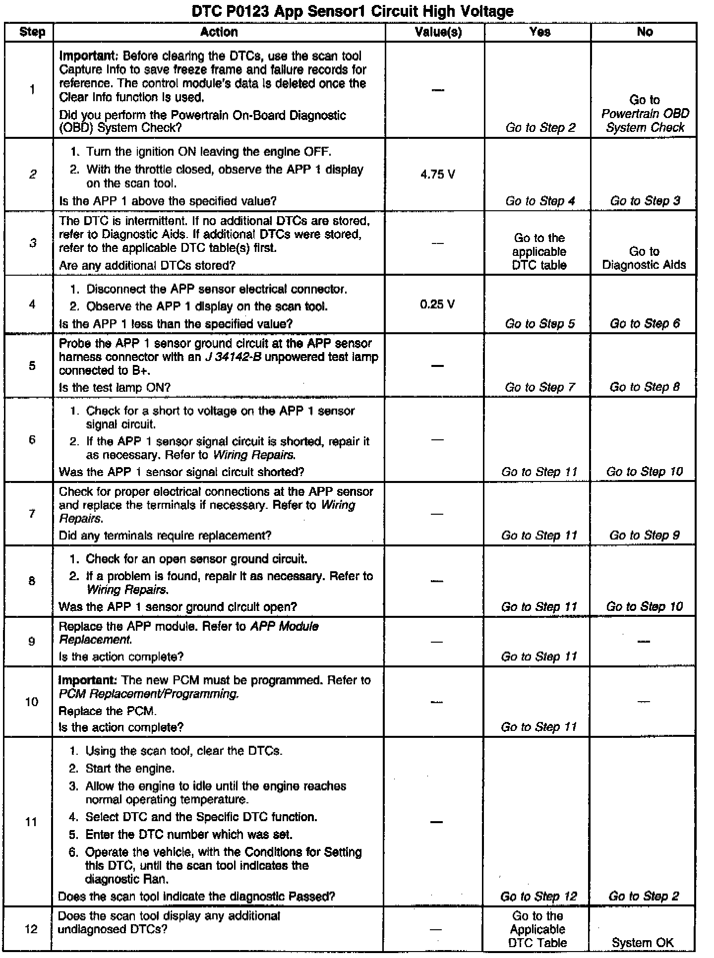 A scan tool reads APP 1 position in volts. It should read about 0.45 to 0.95 volt with the throttle closed and the ignition ON or at idle. Voltage should increase at a steady rate as the throttle is moved toward wide open throttle (WOT). Also, 90% pedal travel is acceptable for correct 0 APP operation. Scan the APP 1 sensor while depressing the accelerator pedal with the engine stopped and the ignition ON. Display should vary from about 0.74 volt when the throttle is closed to about 3.7 volt when throttle is held at wide open throttle (WOT) position. A P0123 will result if the ground circuit is open or the signal circuit is shorted to voltage.