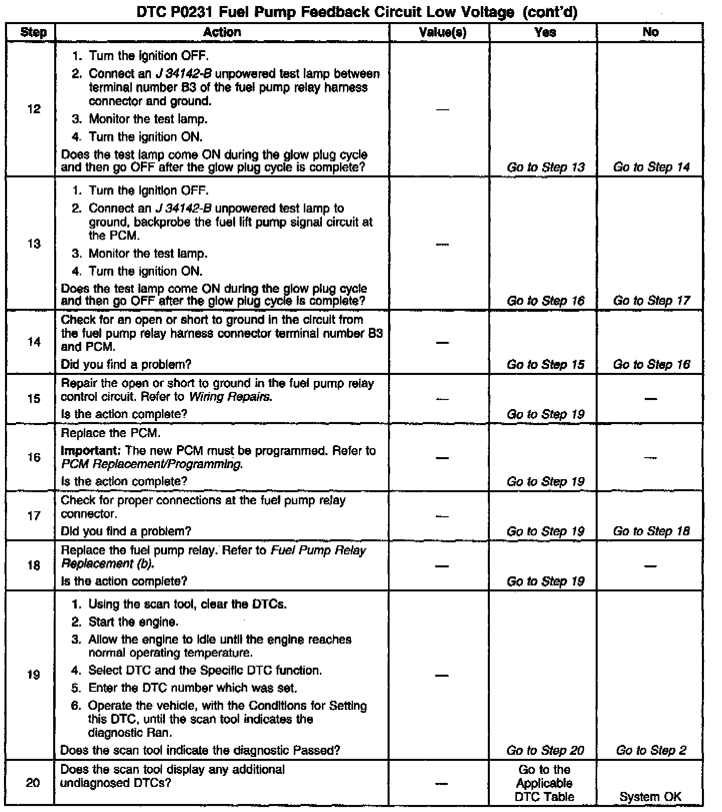 The status of the lift pump is monitored by the PCM. This signal is also used in order to store a DTC if the fuel pump relay is defective or if the fuel pump voltage is lost while the engine is running. There should be about 12 volts on the signal circuit during the glow plug cycle.