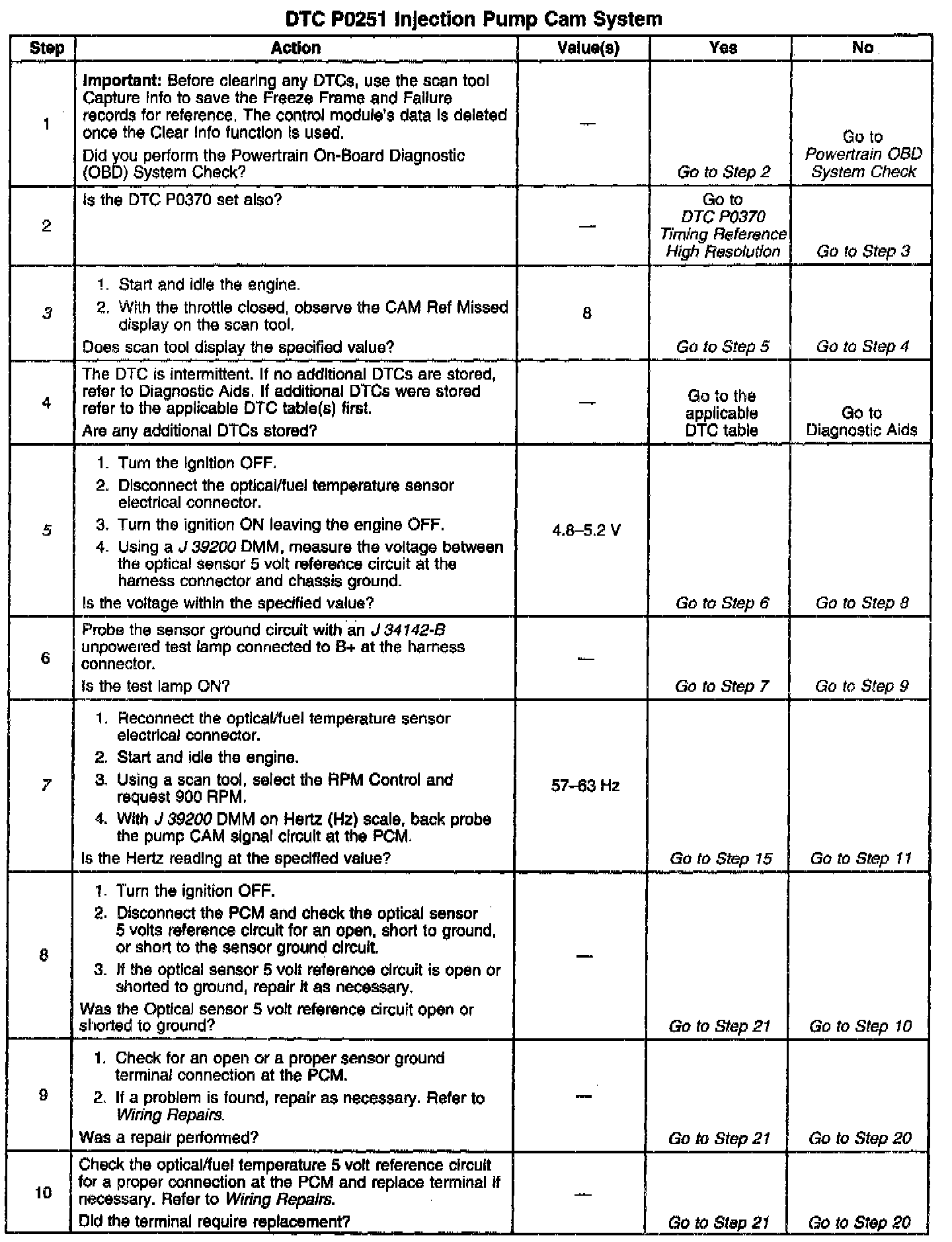 The optical sensor provides a pump cam signal to the PCM by counting the pulses on the sensor which is disk located inside of the injection pump. The pump cam is one of the most important inputs by the PCM for fuel control and timing. This test monitors the number of crankshaft position pulses that have occurred since the last cam pulse. The physical one to one correspondence between the pump cam and the crankshaft implies that if more crank pulses are detected than cam pulses, the cam pulses have been missed.