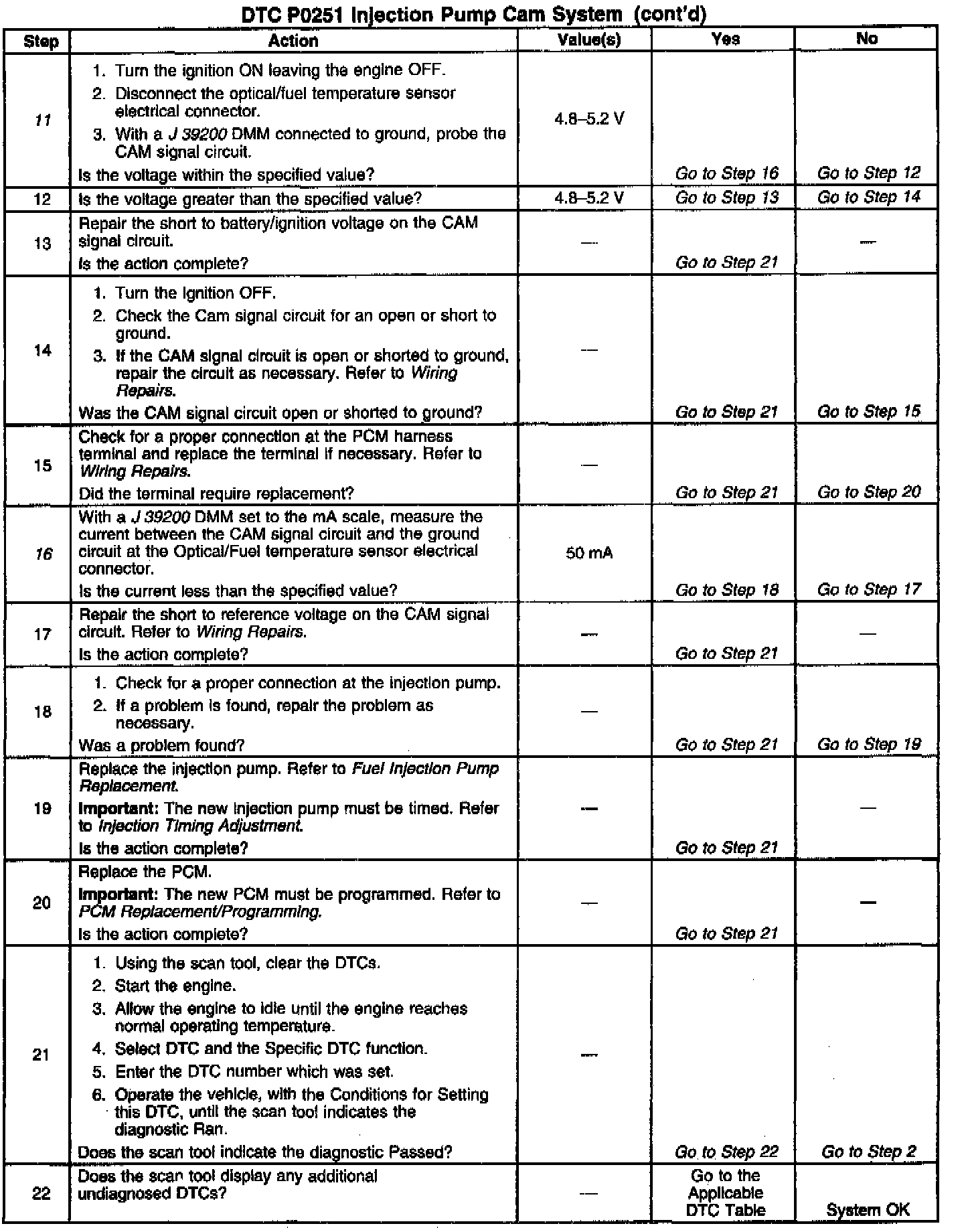 16. This step determines if the signal circuit is shorted to 5V. A normal CAM signal circuit will have 3-5mA. Any reading over 5OmA indicates a short to 5V.