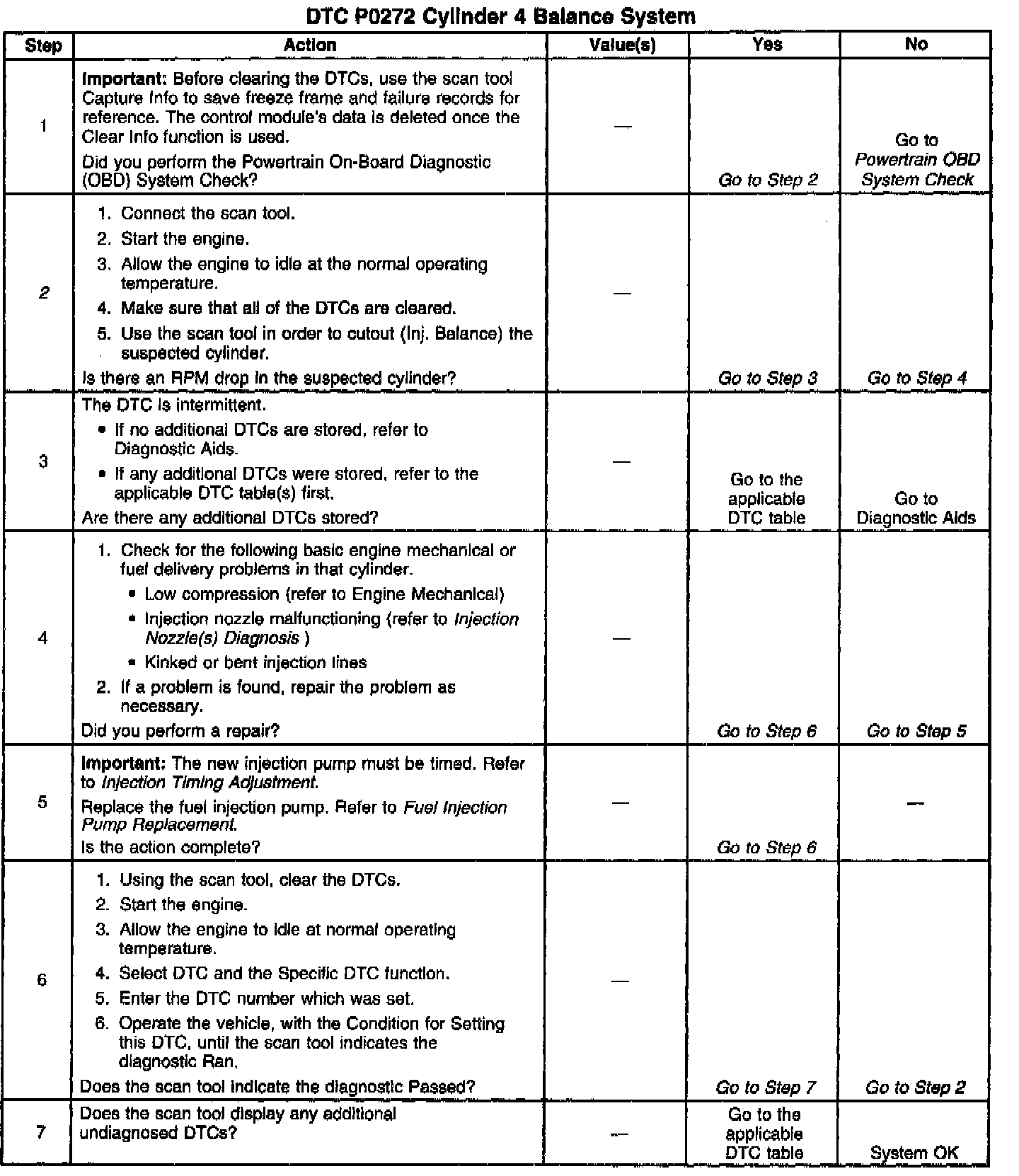 The PCM has the ability to increase and decrease the amount of the fuel to each cylinder in order to provide for a smooth idle operation. If the fuel correction amount exceeds the defined limits, DTC P0272 will set.