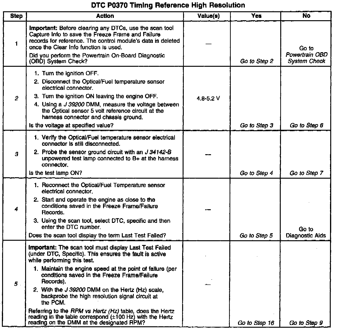 5. This step determines if a High Res signal is being sent to the PGM. Refer to the RPM vs Hertz table to compare the Hertz readings at different RPMs. Using Freeze Frame and Failure Records will help identify the RPM the problem occurs.