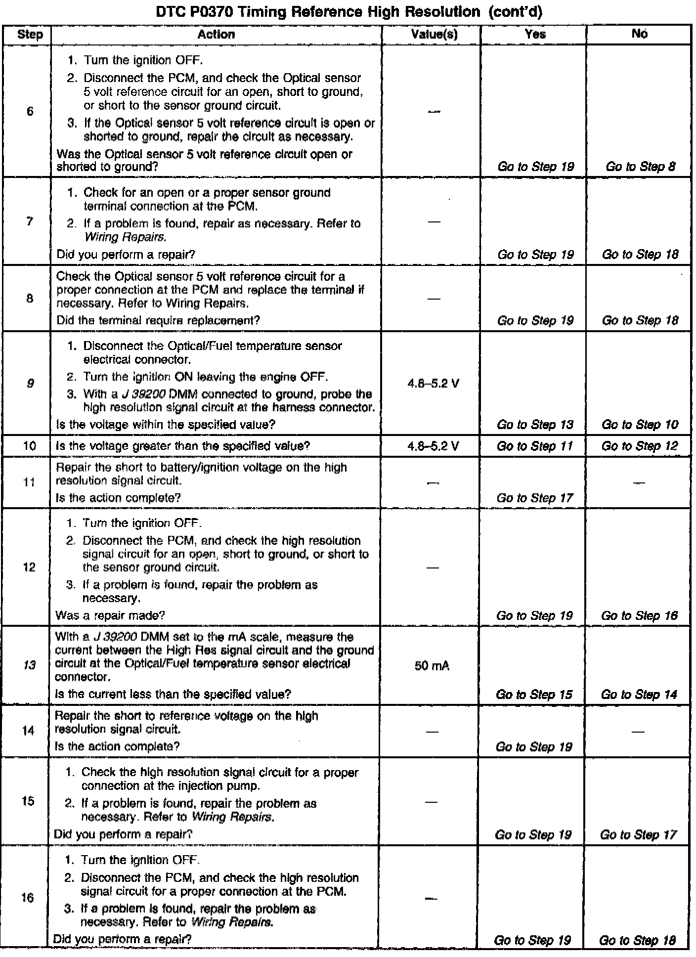 13. This step determines it the signal circuit is shorted to 5V. A normal high res signal circuit will have 3-5mA. Any reading over 5OmA indicates a short to 5V.