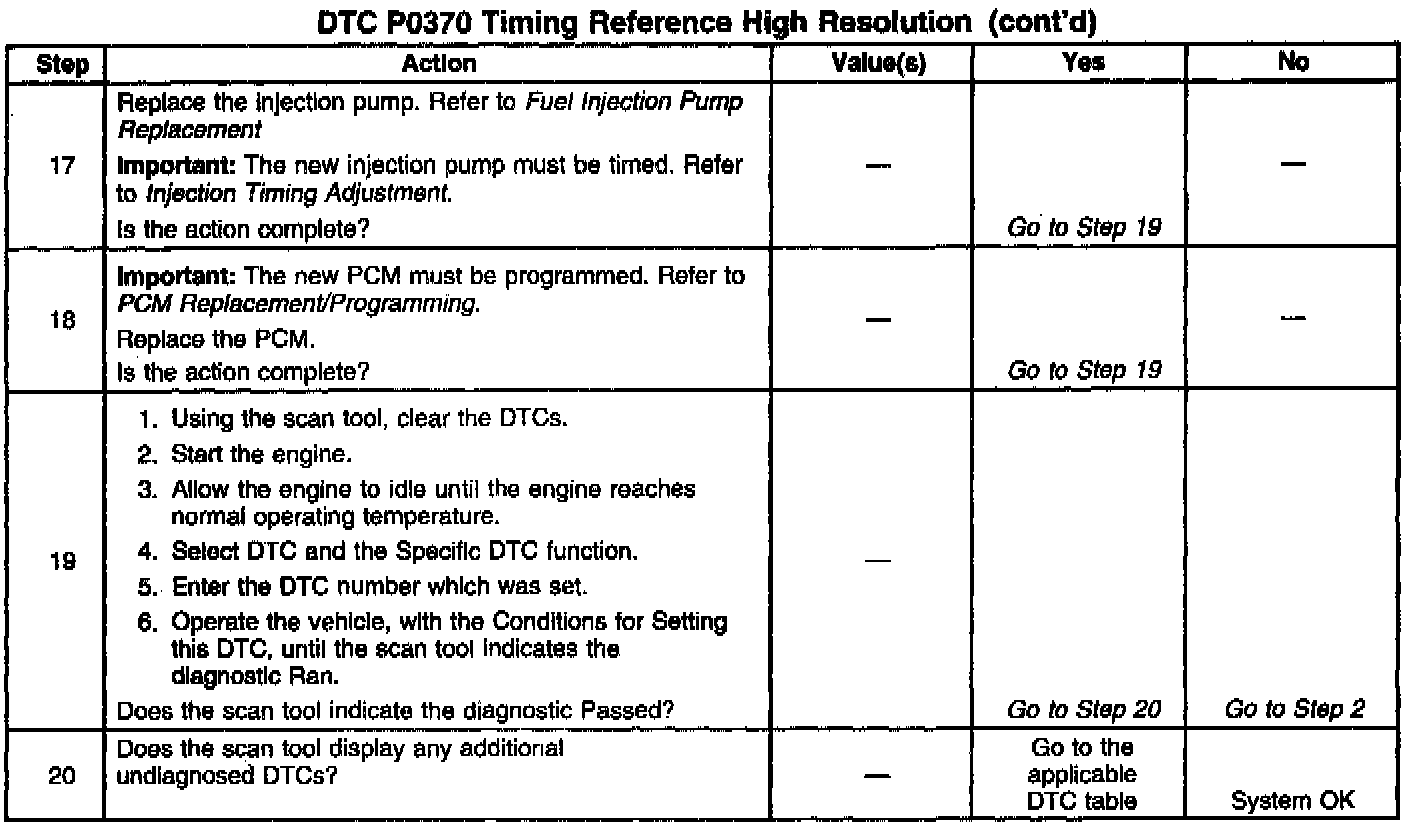 Intermittent DTCs (P0251, P0370 and P1216) may be caused by air entering the fuel system when fuel levels get below 1/8 of a tank while performing hard acceleration or turning maneuvers. Its also possible that a P0251, P0370 and P1216 will set if the vehicle has run out of fuel. Customer driving habits should be checked to determine if the vehicle has been performing in these manners. If the vehicle has been performing in these conditions, bleed fuel system of all air and test drive vehicle.