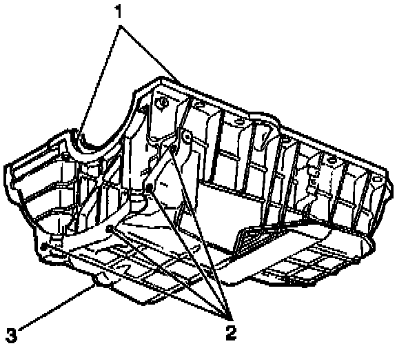 ^ Gouges or damage to the oil pan sealing surfaces (1).