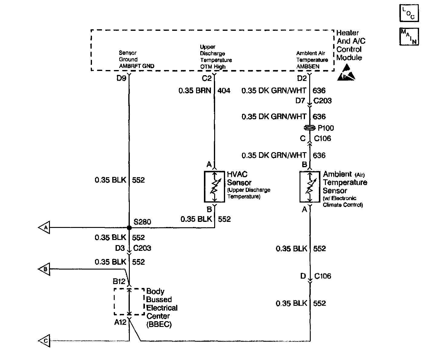 The passenger compartment temperature sensor # 1 (upper) is a thermistor used to control the signal voltage in the heater and A/C control module. The heater and A/C control module supplies a reference voltage (about 5 volts) on CKT 404 to the sensor. When the upper duct air temperature is cold, the thermistor resistance is high. Therefore, the heater and A/C control module will receive a high voltage input. If the upper duct air temperature is hot, the thermistor resistance is low. Therefore, the heater and A/C control module will receive a low signal voltage input. The output air temperature sensor # 1 (upper) is used to enhance the temperature control. Refer to Sensor Resistance Table. Sensor Resistance Tables - Electronic Climate Control (ECC)