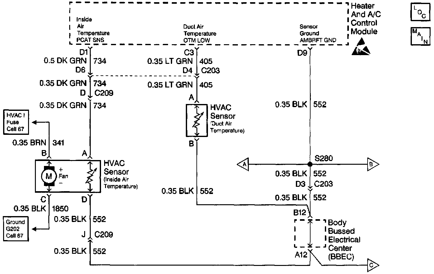 The output air temperature sensor # 2 (lower) is a thermistor used to control the signal voltage in the heater and A/C control module. The heater and A/C control module supplies a reference voltage (about 5 volts) on CKT 405 to the sensor. When the lower duct air temperature is cold, the thermistor resistance is high. Therefore, the heater and A/C control module will receive a high voltage input. If the lower duct air temperature is hot, the thermistor resistance is low. Therefore, the heater and A/C control module will receive a low signal voltage input. The output air temperature sensor # 2 (lower) is used to enhance the temperature control. Refer to Sensor Resistance Table. Sensor Resistance Tables - Electronic Climate Control (ECC)