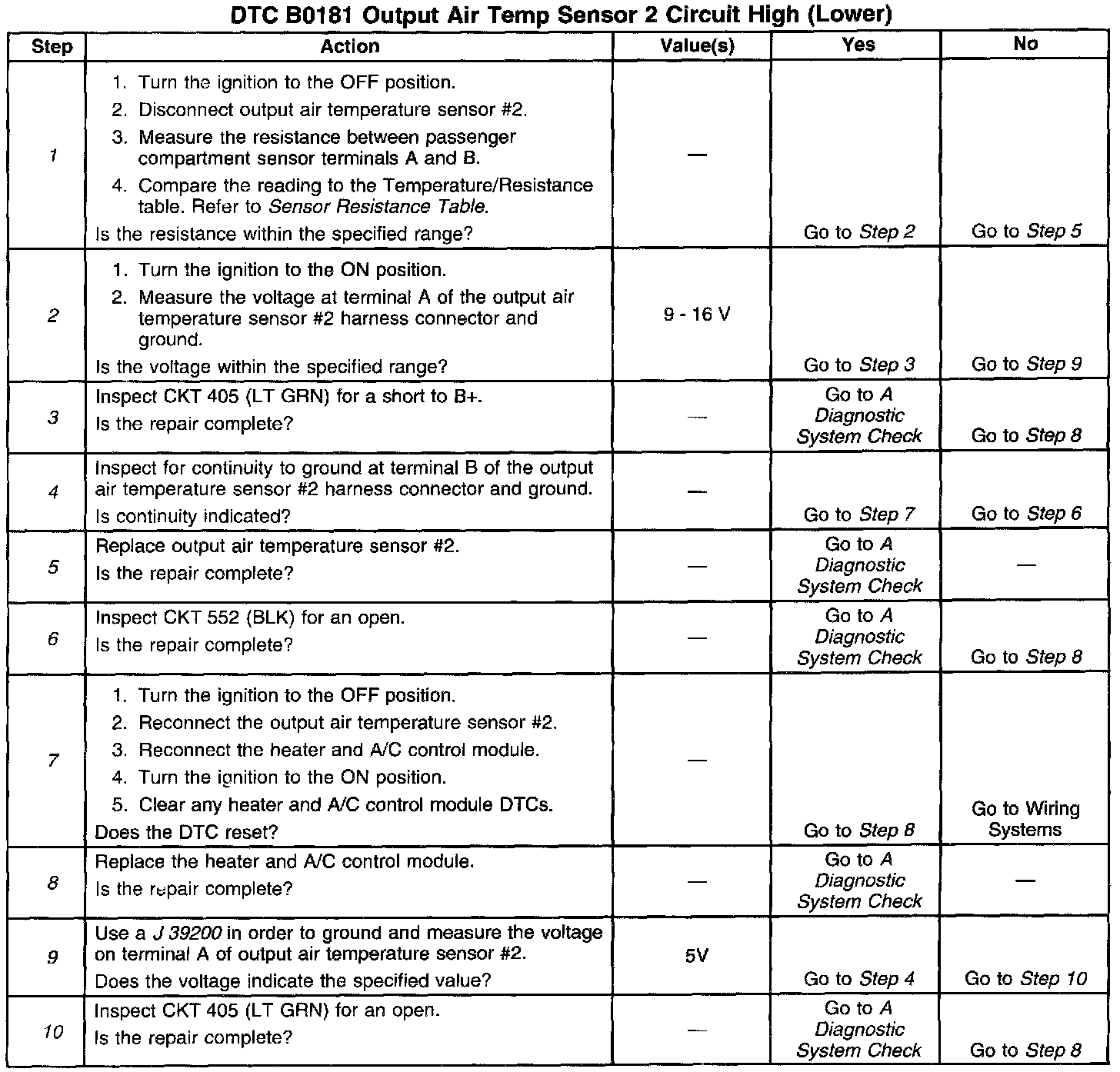 When the ignition is ON, the heater and A/C control module will detect DTC B0181 any time that CKT 405 is near 5 volts or higher.