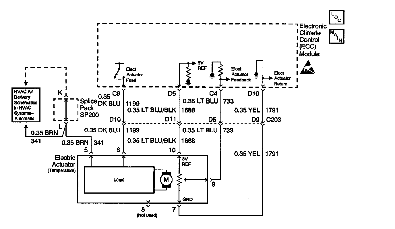 The HVAC control module receives a position signal from the air temperature actuator. The air temperature actuator position sensor is a potentiometer that is tied to a 5 V reference source. The variable output from the potentiometer feeds back a position signal to a pull-up resistor which is located in the HVAC control module. This signal determines the necessary drive signal to the actuator motor which provides the proper air temperature door position. This value is stored in the Keep Alive Memory (KAM) portion of the HVAC control module. When the air temperature door is in a full hot position the scan tool will read above 190 Counts. When the air temperature door is in full cold position the scan tool will read below 48 Counts. Normal operating range is 46 Counts to 194 Counts.