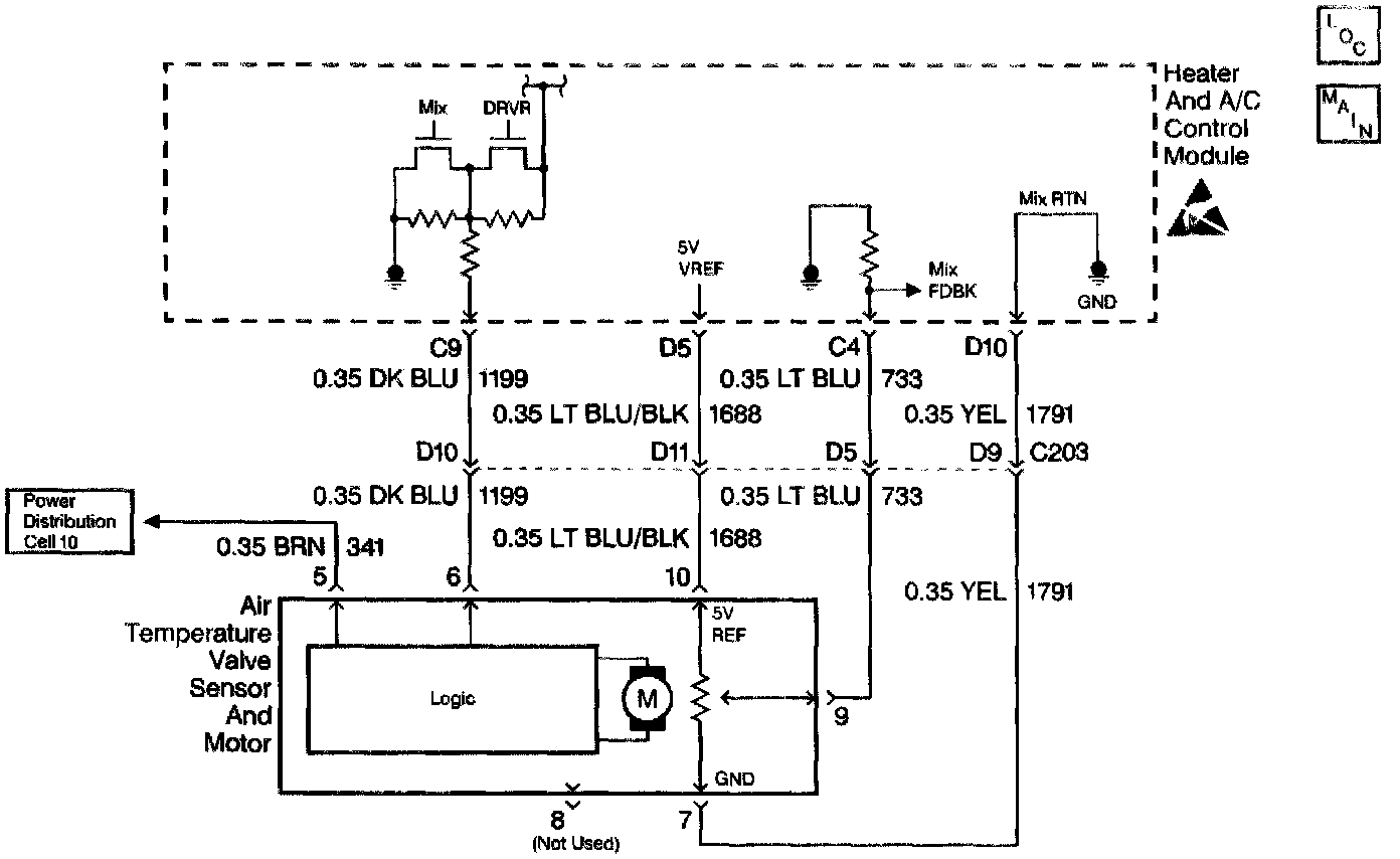 The electronic actuator is driven by the heater and A/C control module to operate the air mix door. The position of the air mix door is adjusted in order to maintain the verified air-outlet temperature. A feedback potentiometer is used in the flat-pack motor so that the heater and A/C control module will know the position of the air mix door. A low voltage at CKT 733 (about 1.0 volt) represents a cold air valve position and a high voltage on CKT 733 (about 4.0 volts) represents a hot air valve position. The heater and A/C control module drives the electric actuator through CKT 1199 to the logic portion of the electric actuator by applying 0-2.5-5 volts through this circuit. Applying 5.0 volts on CKT 1199 to the logic portion of the electronic actuator will cause the air mix valve to move to the full cold position. Applying 0.0 volts on CKT 1199 to the logic portion of the electric actuator will cause the air mix door to move to the full hot position. Applying approximately 2.5 volts on CKT 1199 will cause the electric actuator to stop.