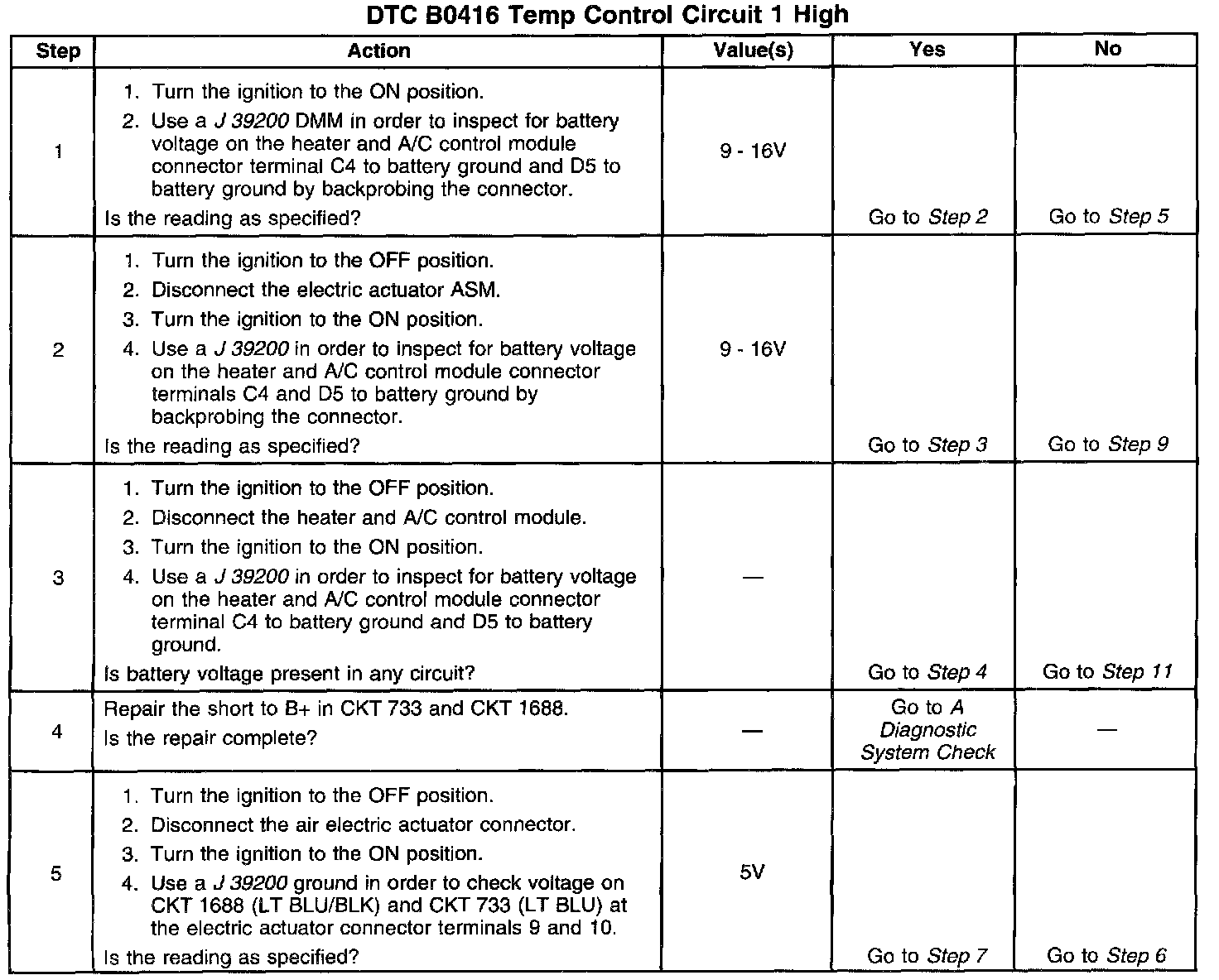 With the ignition ON the heater and A/C control module will detect DTC B0416 anytime that CKT 733 is near 5 volts or higher.