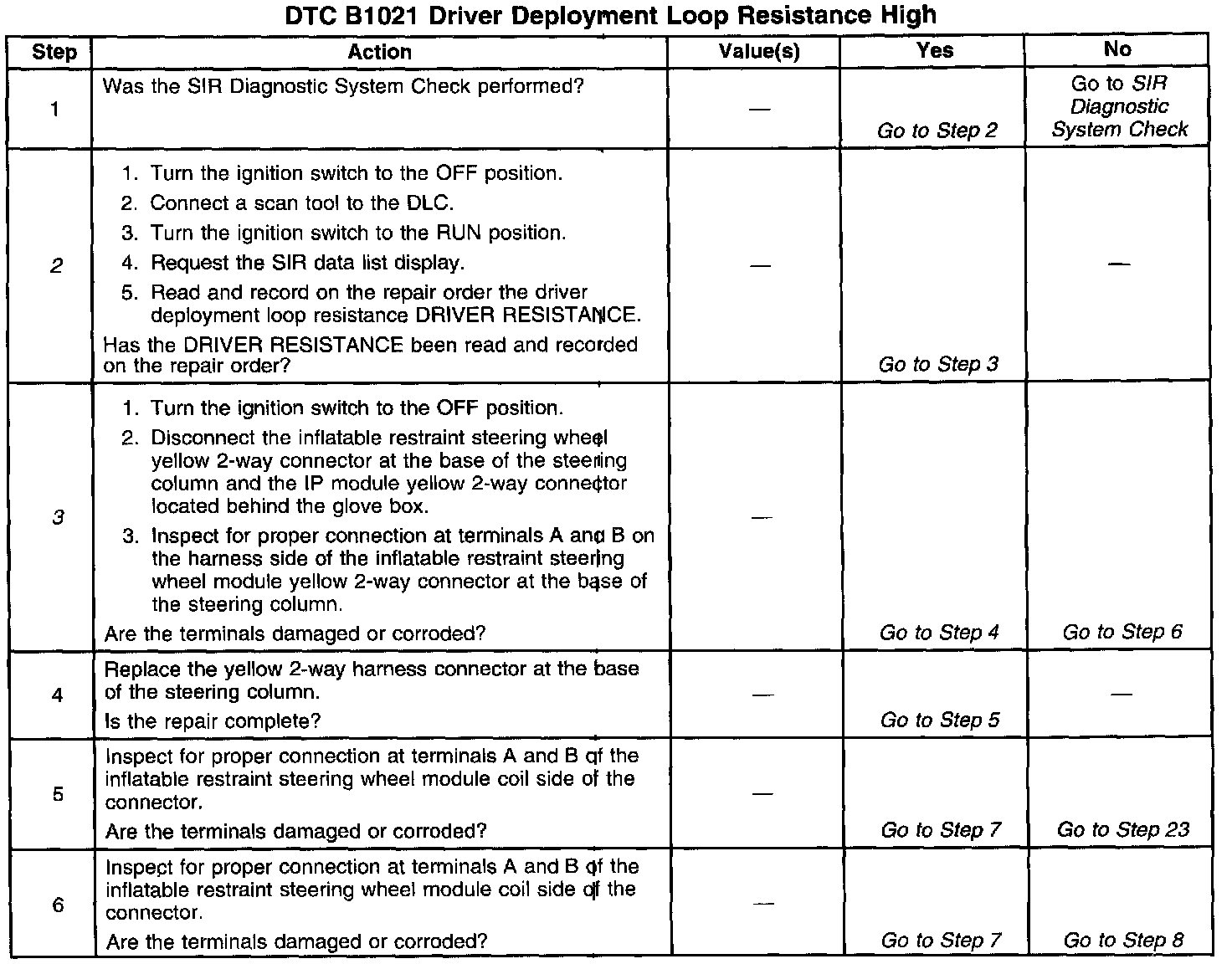 The numbers below refer to the step numbers on the diagnostic table: