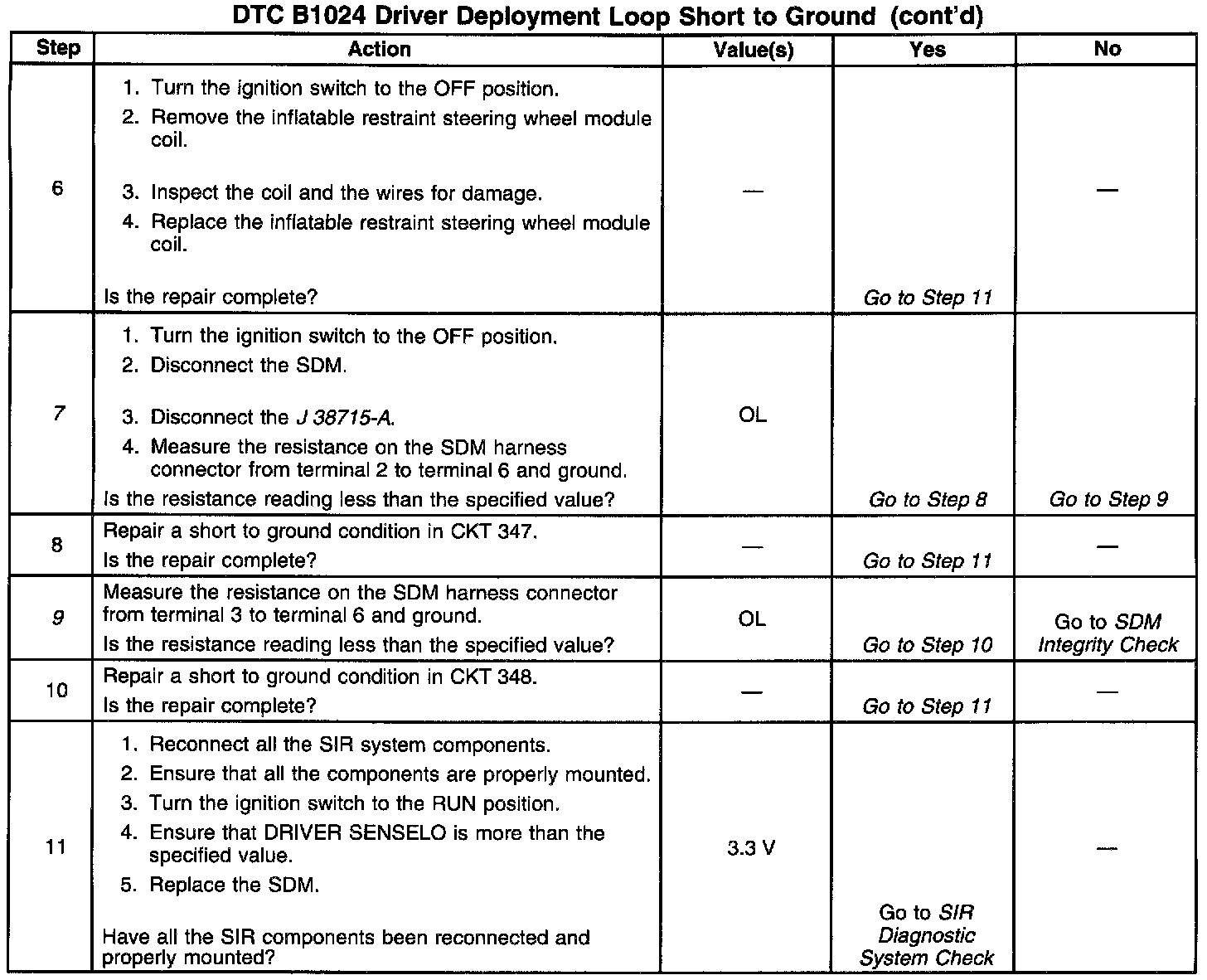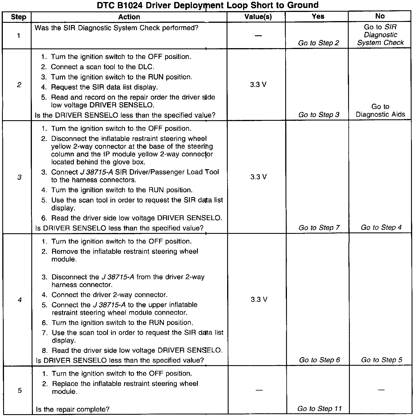 A short to ground in the inflatable restraint steering wheel module circuit can cause an intermittent condition. A DTC B1024 would be accompanied by DTC B1071. Inspect CKT 347 and CKT 348 carefully for cutting or chafing. A careful inspection of the circuits and components indicated on the DTC B1024 table is essential in order to prevent damage to the replacement inflatable restraint Sensing and Diagnostic Module (SDM). The diagnostic table directs the technician to note the entry value of DRIVER SENSELO. Comparing the value of DRIVER SENSELO can be helpful in determining if an intermittent condition exists.