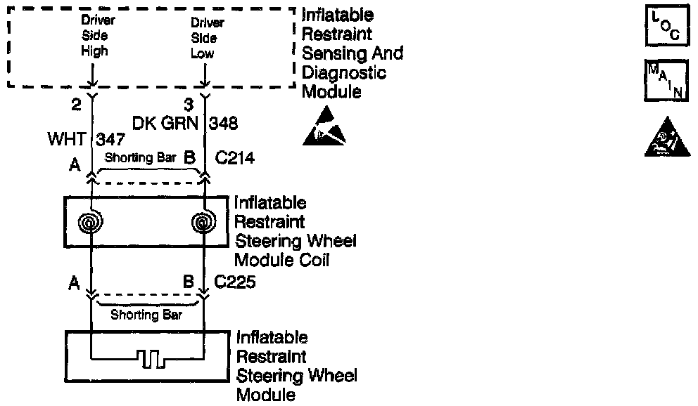 When you first turn the ignition switch to the RUN position, the inflatable restraint Sensing and Diagnostic Module (SDM) performs tests to diagnose critical malfunctions within itself. Upon passing these tests IGNITION 1, 23 VLR and the deployment loop voltages are measured to make sure they are within their respective normal voltage ranges. The SDM monitors the voltages at DRIVER SIDE LOW terminal 3 and PASSENGER SIDE LOW terminal 4 to detect shorts to ground in the inflator module circuits. The service wait time is 10 minutes. Refer to Disabling the SIR System or Enabling the SIR System procedures. Air Bag(s) Arming and Disarming