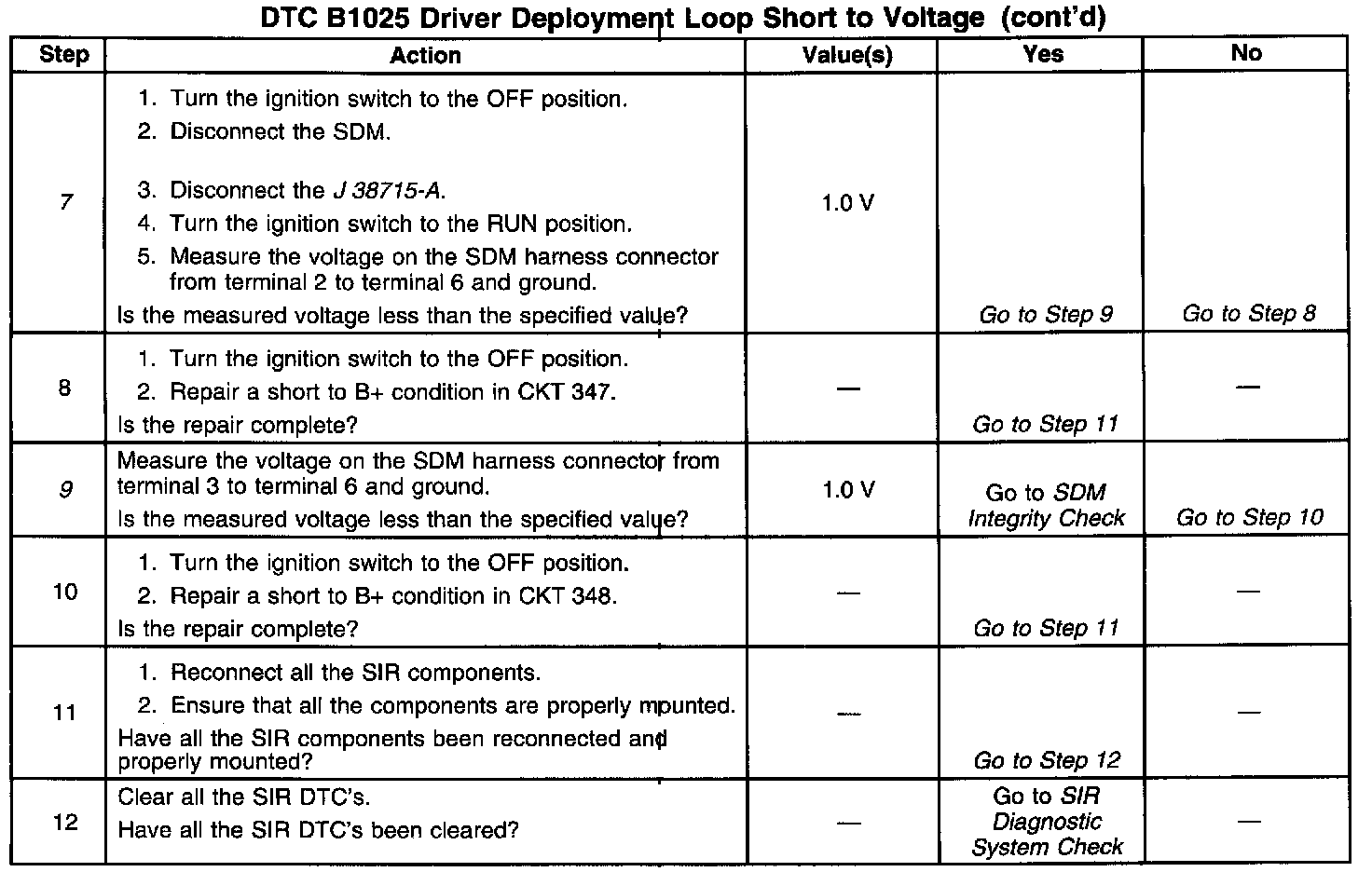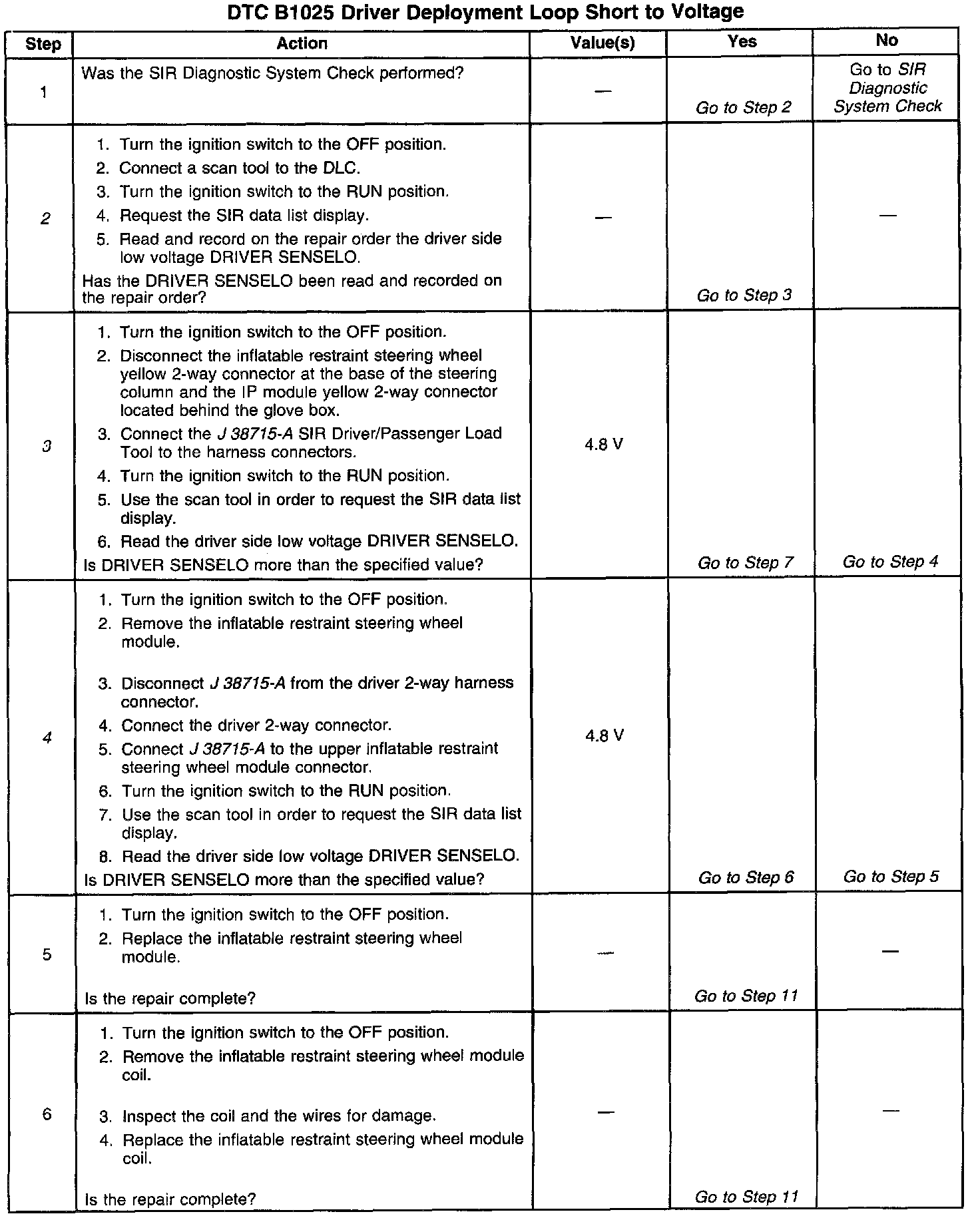A short to B+ in the inflatable restraint steering wheel module circuit can cause an intermittent condition. Inspect CKT 347 and CKT 348 carefully for cutting or chafing. The diagnostic table directs the technician to note the entry value of DRIVER SENSELO. Comparing the value of DRIVER SENSELO can be helpful in determining if an intermittent condition exists. When measurements are requested in this table, use the J 39200 Digital Multimeter with the correct terminal adapter from the J 35616-A Connector Test Adapter Kit. When an inspection for proper connection is requested, refer to Intermittents and Poor Connections. When a wire, connector or terminal repair is requested, use the J 38125-B Terminal Repair Kit. Refer to Wiring Repair. Intermittent Problems SIR Wiring Repair