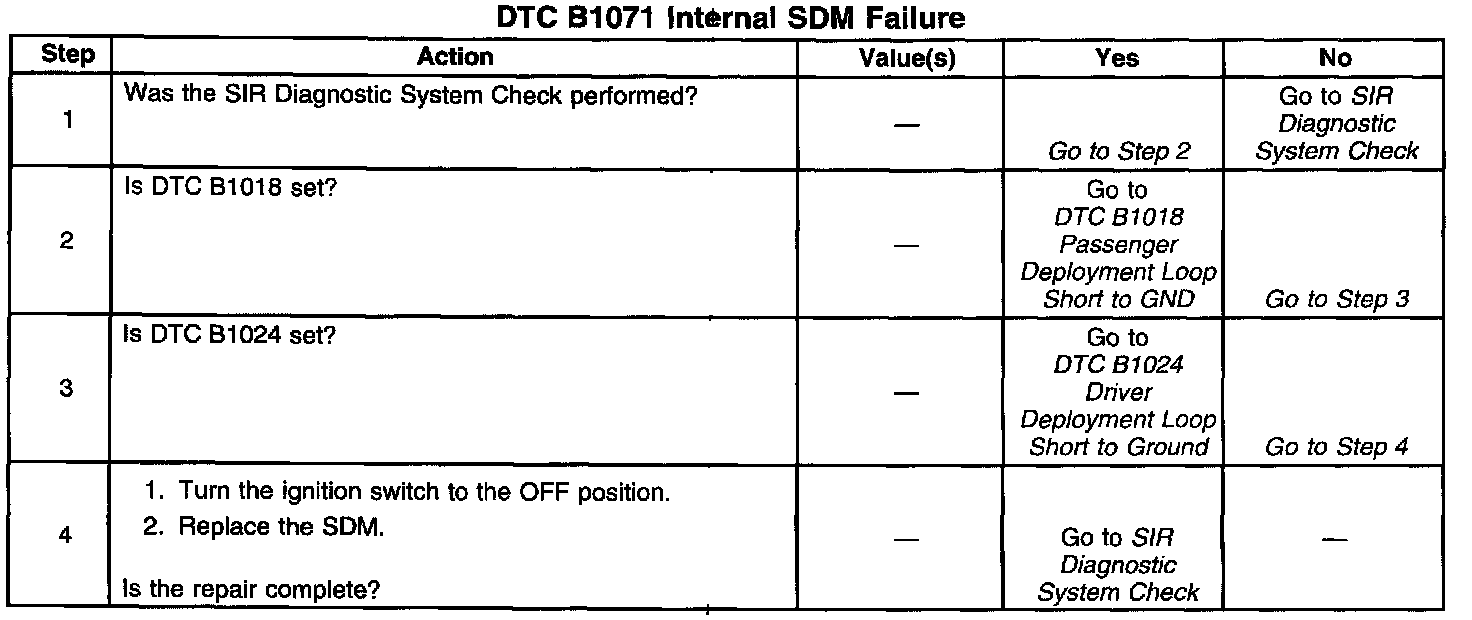 DTC B1071 is an indication of a potential internal inflatable restraint Sensing and Diagnostic Module (SDM) malfunction. DTC B1071 will set upon detection of any condition in the table below.