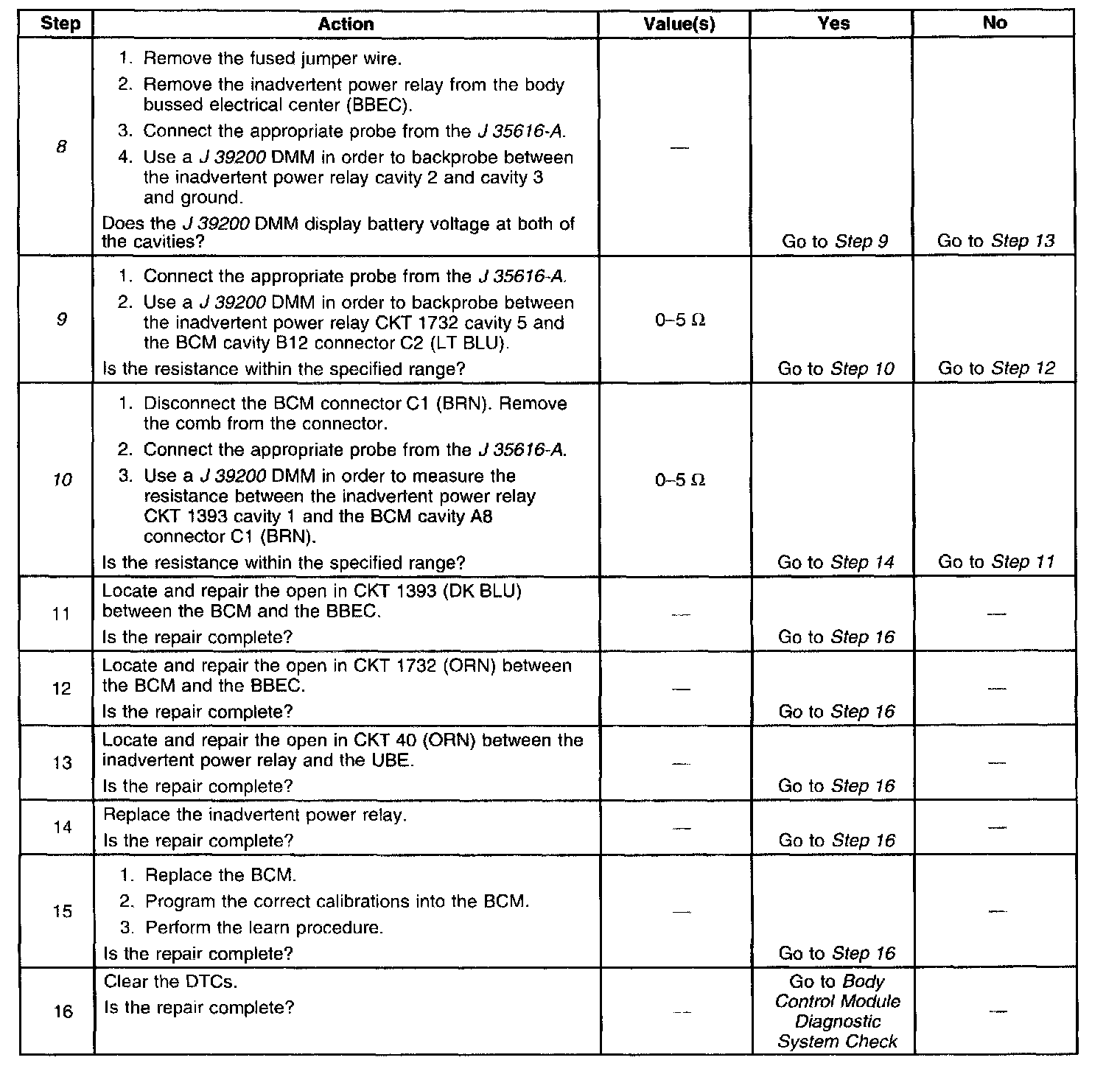 9. This step determines it CKT 1393 is open between the inadvertent power relay and the BCM.