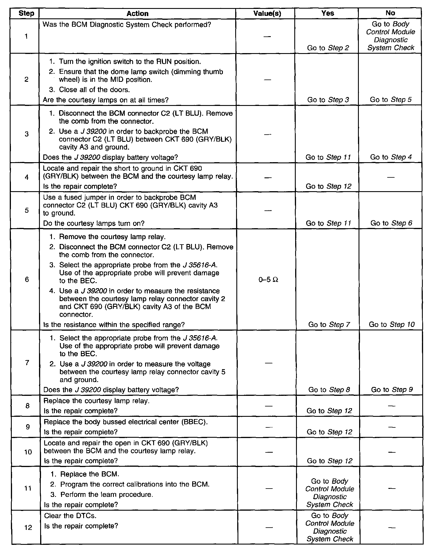 2. This step determines if CKT 690 is shorted or open between the courtesy lamp relay and the BCM.
