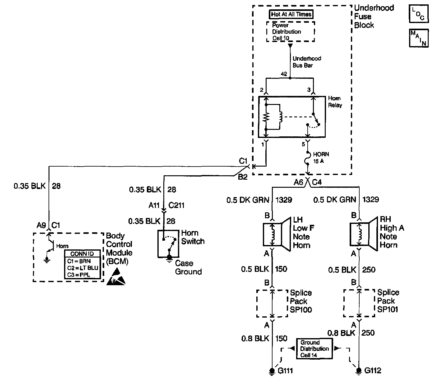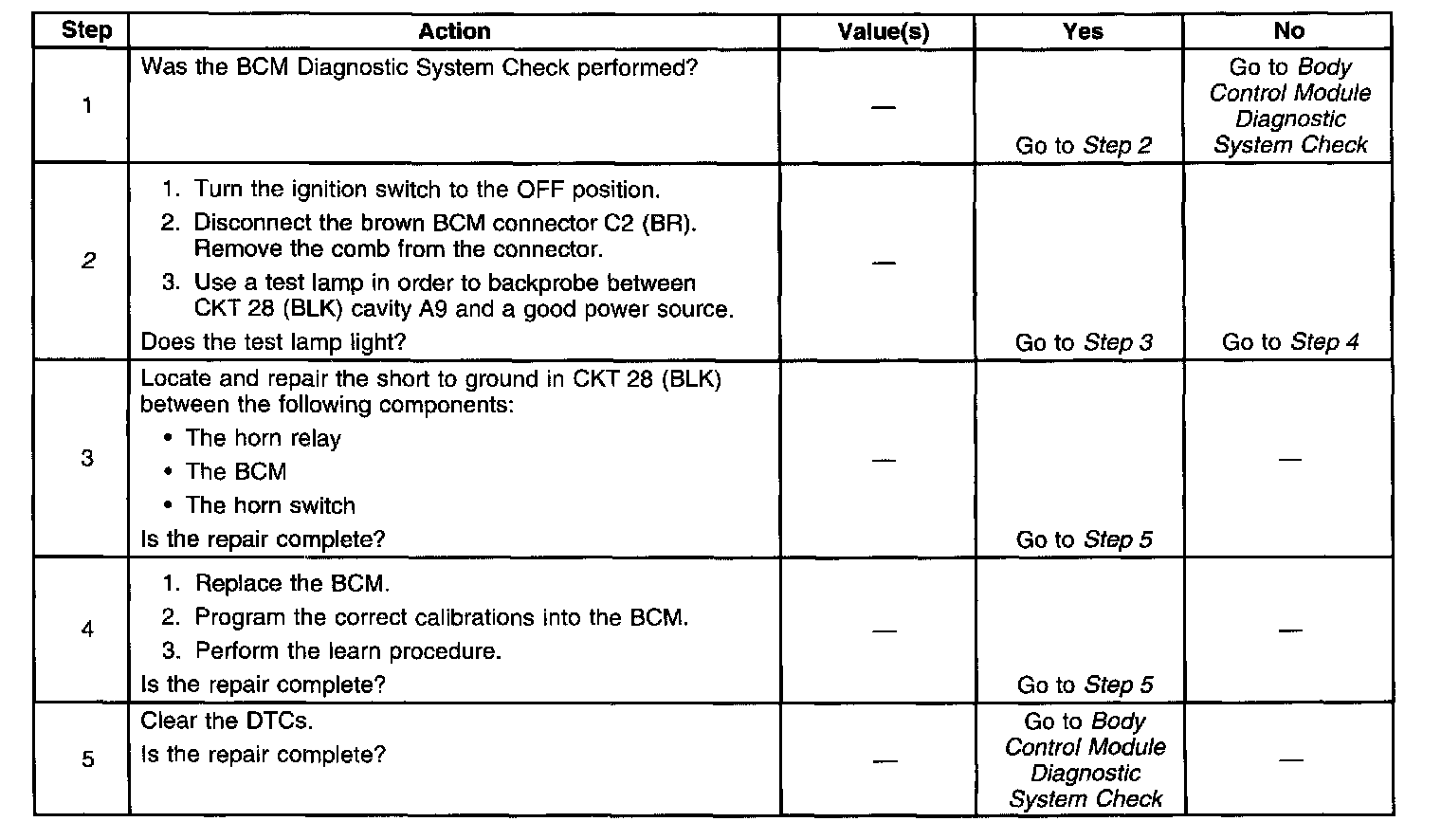 CKT 28 is an input to the Body Control Module (BCM). The BCM monitors CKT 28 in order to determine if the horn circuit is shorted to ground.